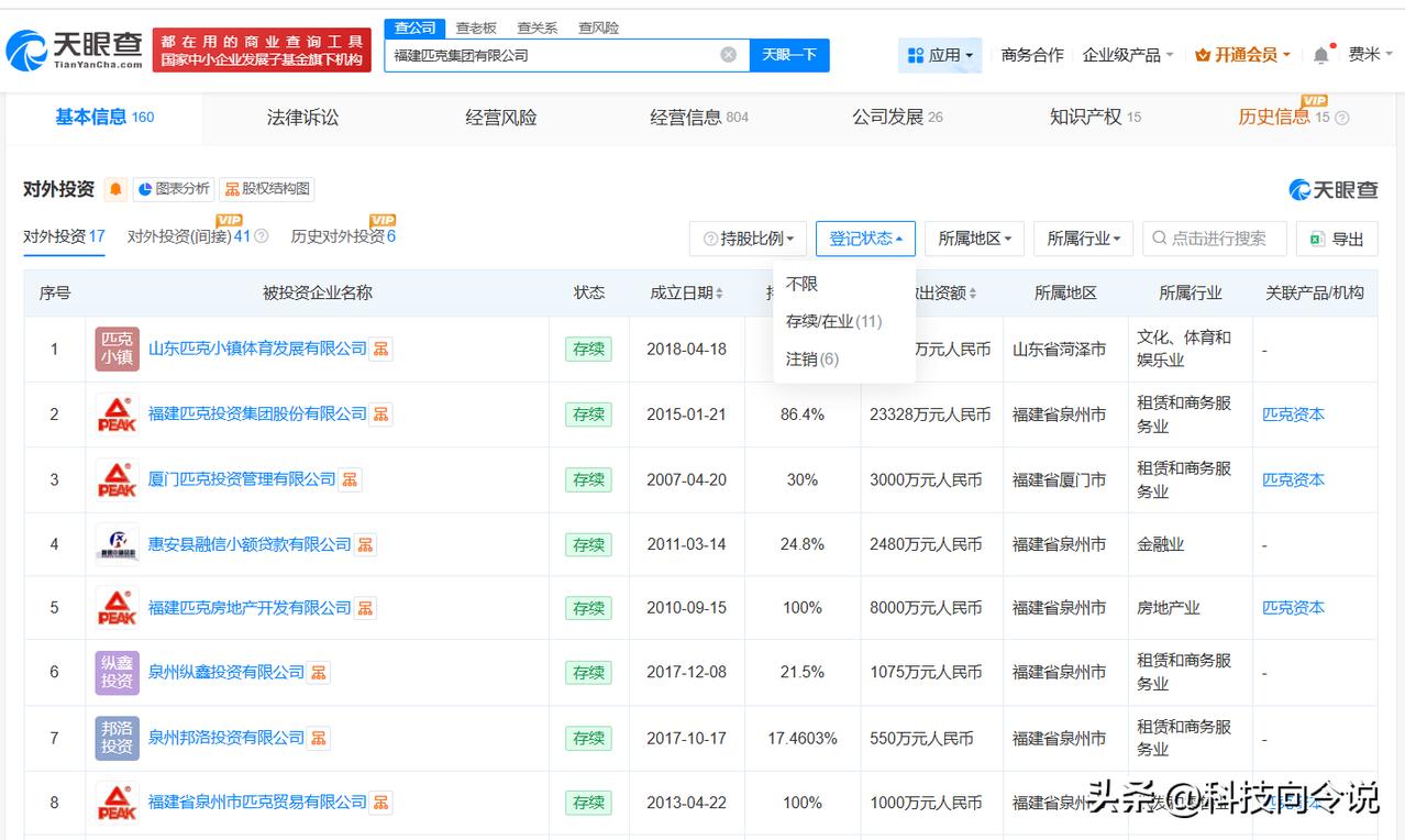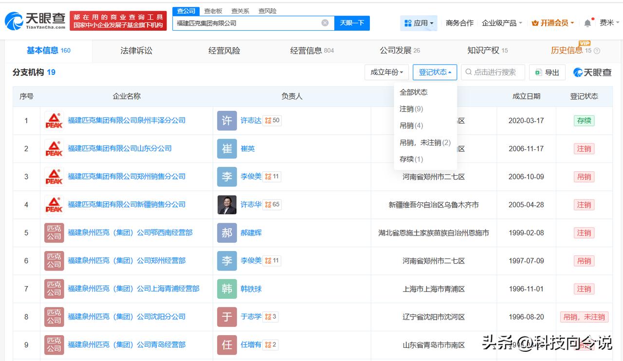 【匹克集团旗下十余家分支机构已吊销或注销匹克集团旗下多家公司已注销匹克中国关