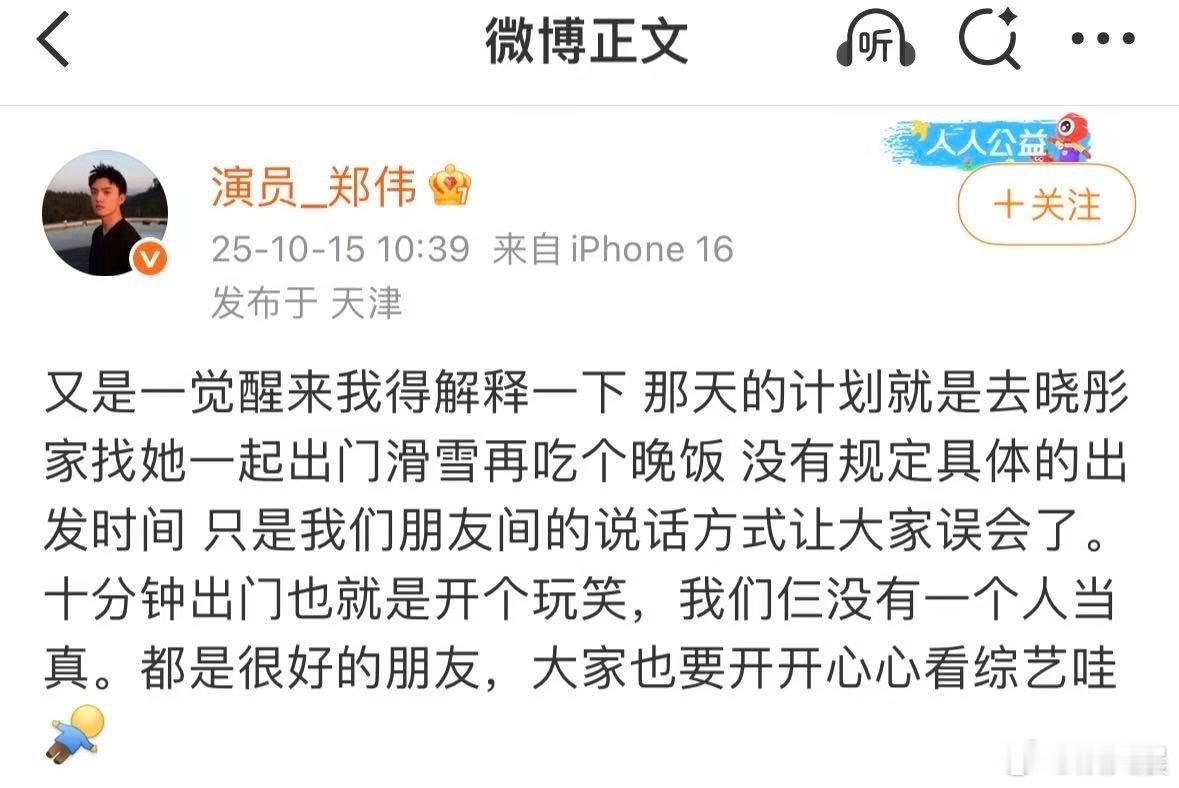 郑伟帮苏晓彤解释郑伟直接发文帮苏晓彤说清楚!本来就是日常记录,没所谓的出发时间