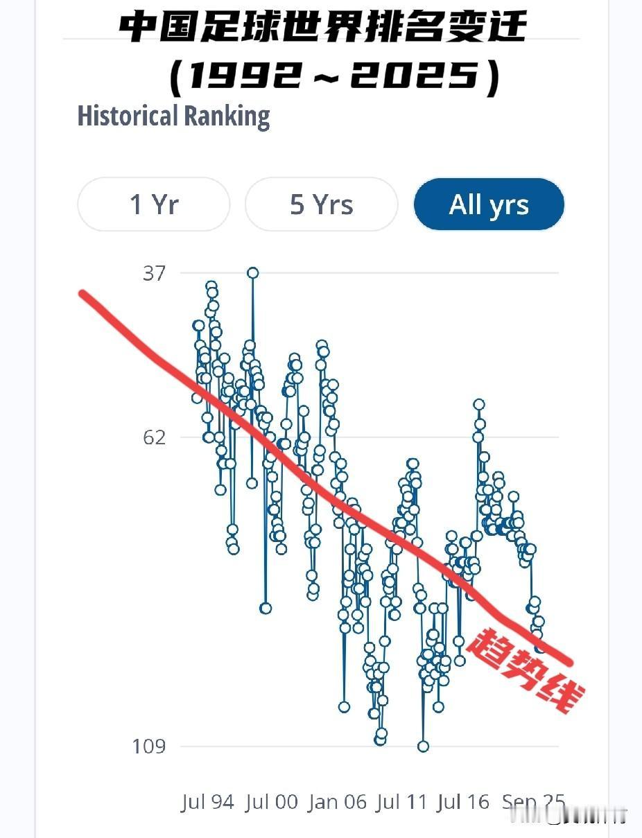 中日两国国际足联世界排名对比: [心]中国足球世界排名变化区间:37~109名,