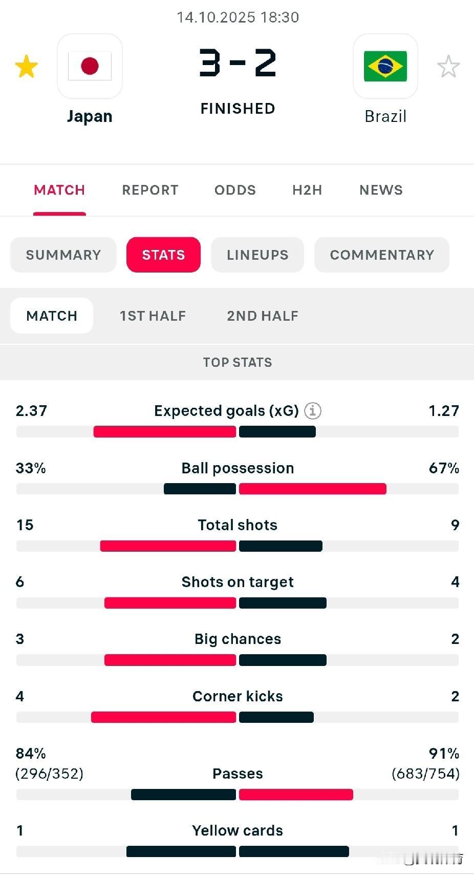 中日两国国际足联世界排名对比: [心]中国足球世界排名变化区间:37~109名,1992~2025年之间下降趋势明显。 [微风]日本足球世界排名变化区间:9~66名,变化趋势线稳步提升在。 [微风]近日,日本国家队3-2战胜巴西国家队。从两国足球队比赛的技术统计数据看,日本与巴西的预期比分是2.37:1.27,日本占优。 [爱慕]如果日本足球队打入美加墨世界杯前八,甚至是更好成绩,千万不要大惊小怪。