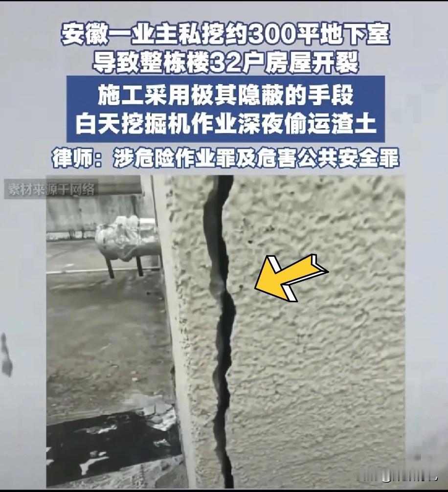 安徽32户家庭本是安安稳稳过日子,谁知邻居一时贪念,私挖地下室,导致房屋受损,墙体开裂,面临无家可归的境地。 本小区32户家庭,因邻居私挖地下室,导致房屋受损,墙体开裂,面临无家可归的境地。 业主维权:我们团结在一起就不怕没处说话的,依法维权,告上法庭,让他们承担一切责任。 物业根本不作为,推诿扔球,我们也没有地方申诉的,更没有地方发声的,我们团结在一起就不怕没处说话的,依法维权,告上法庭,让他们承担一切责任。 物业推诿:这事儿跟我们没关系,你们自己去找律师! 本文来源于网络。