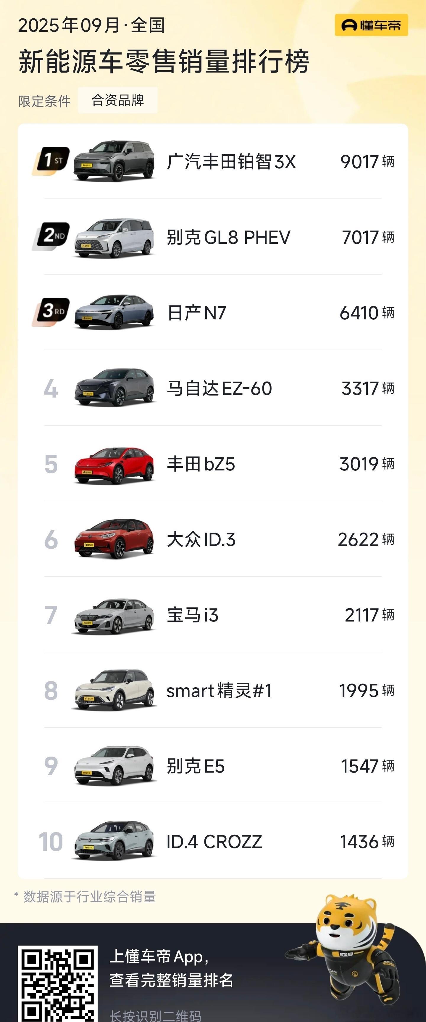 不得不说,铂智3X这次选择香港作为首站,意义挺大的——符合丰田全球品质标准,能进香港市场,就意味着接下来有可能卖到更多地区。而且你们看9月合资新能源车的销量榜,它已经在内地拿过第一,口碑实打实摆在那。
