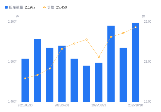日期A股户数(户)流通A股户均持股数(股)户均持股市值(万元)2025-10-10219003600.309.162025-09-19194004064.2610.102025-09-10216003650.318.942025-08-29179004404.849.912025-08-20176004479.9210.852025-08-08183004308.5610.262025-07-31196004022.799.372025-07-18194004064.268.672025-06-30202653890.788.042025-05-30183003314.286.74