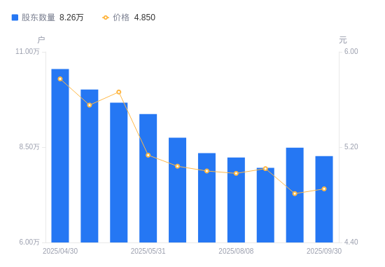 日期A股户数(户)流通A股户均持股数(股)户均持股市值(万元)2025-09-308264814909.747.232025-09-198486614520.066.982025-08-207958115484.357.772025-08-088231114970.787.462025-07-318345014766.447.382025-06-308748114086.037.102025-05-319367213155.056.752025-05-209668912744.577.222025-05-0910012212307.586.832025-04-3010548911681.416.74