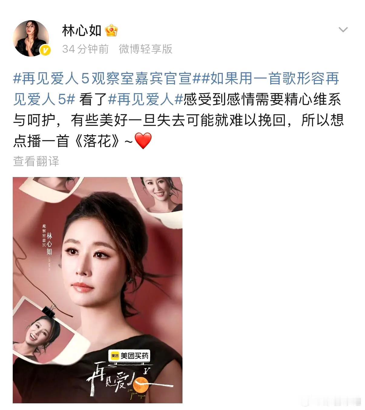 林心如《再见爱人5》官宣了!!不知道细腻的演员站在观察员的视角会输出什么内容呢?