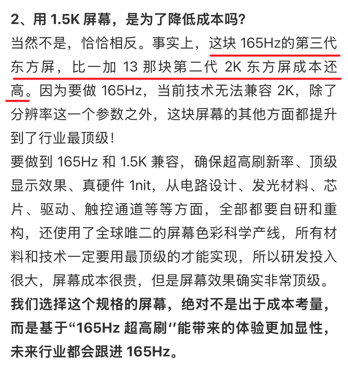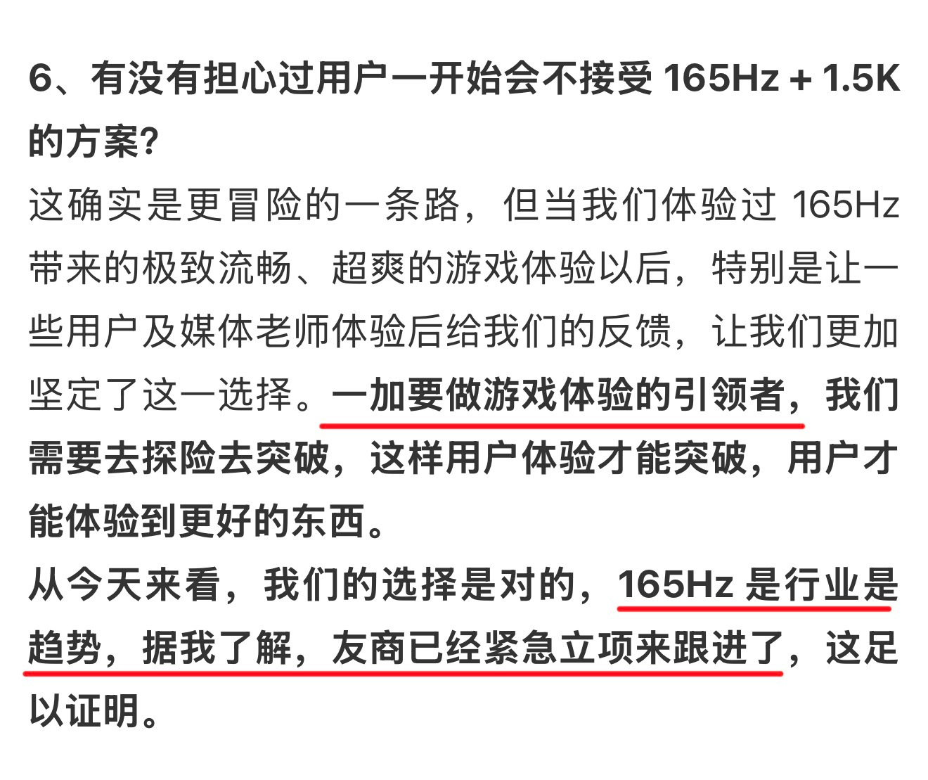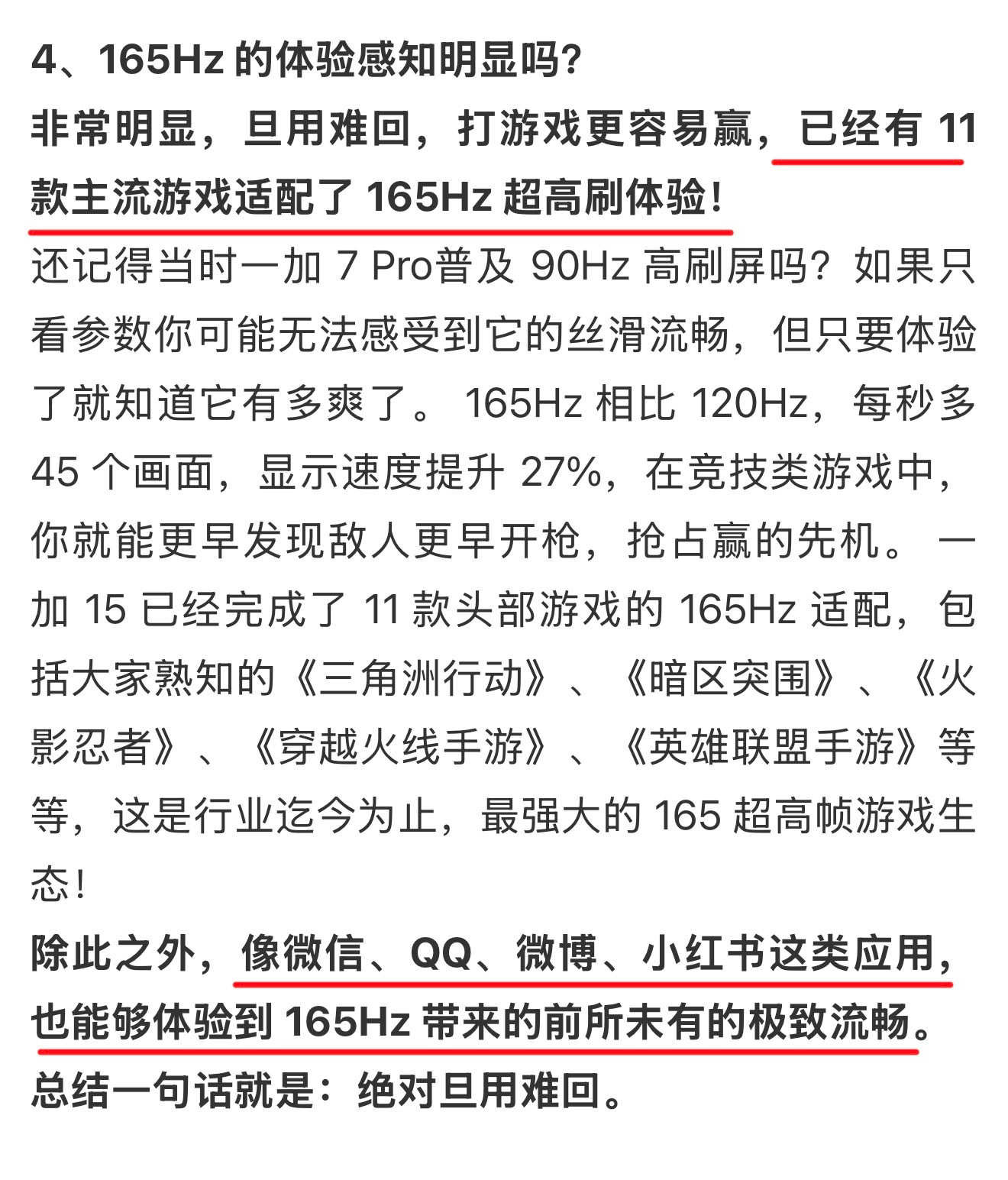 而且目前已经有11款主流游戏和主流图文类App适配165Hz了,我之前参加一加活动已经在现场体验过了,跟120Hz屏幕对比起来更丝滑,体感很明显,确实更的确是旦用难回。一个功能好不好,全看后面跟不跟,李杰说目前已经有其它厂商开始立项跟进了,咱们可以拭目以待[笑而不语]