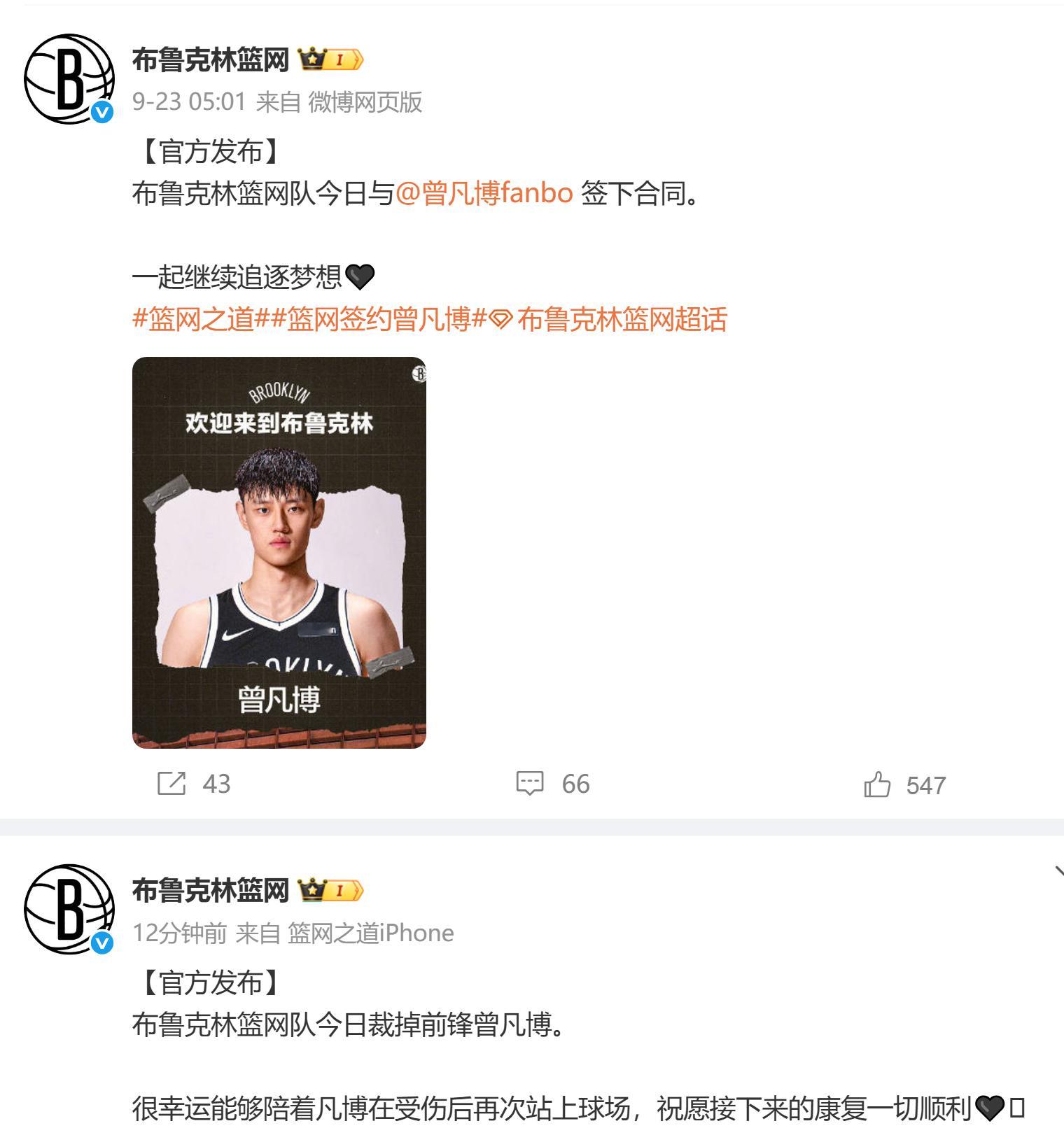 9月23日官宣签约,10月15日官宣裁掉曾凡博。