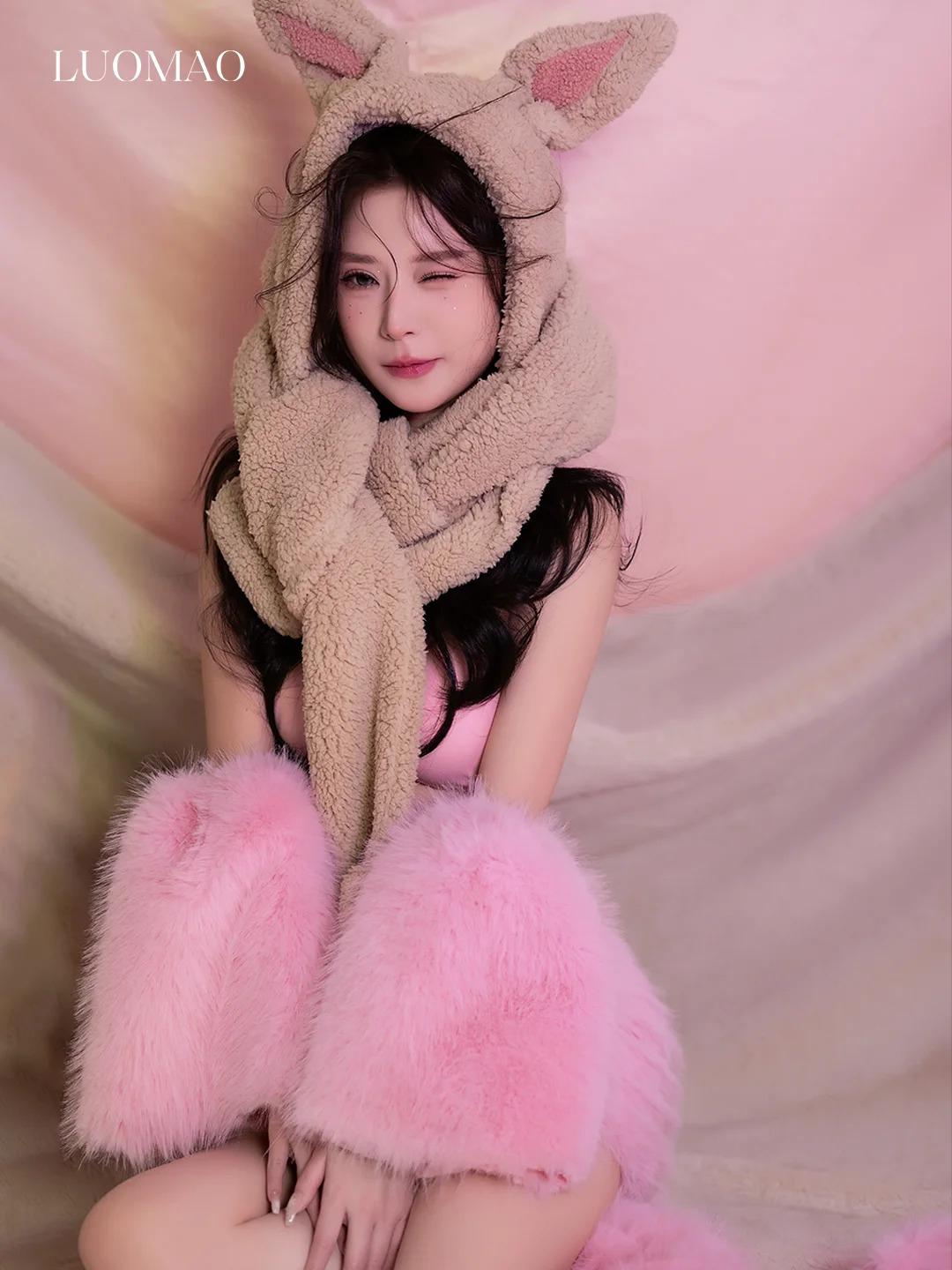 软乎乎的兔耳帽配粉绒套装,每一缕绒毛都在迸发少女心事
