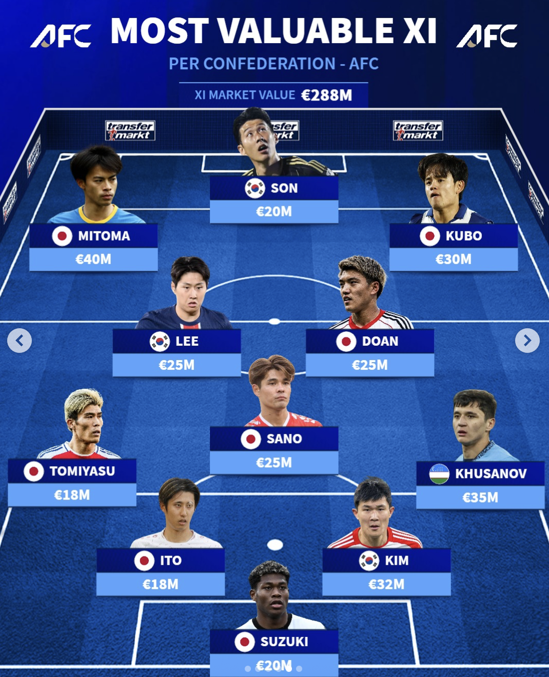 阵容总身价为2.88亿欧,其中有7名日本球员、3名韩国球员和1名乌兹别克斯坦球员。三笘薰以4000万欧领衔阵容。