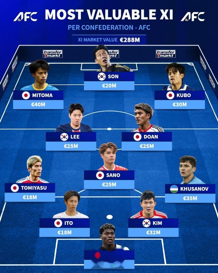 直播吧10月16日讯德转盘点了亚足联球员的最高身价阵容,整套阵容总价值高达2.88亿欧元。其中日本球员三笘薰以4000万欧元成为身价最高的球员,乌兹别克斯坦球员胡桑诺夫以3500万欧元位列第二。