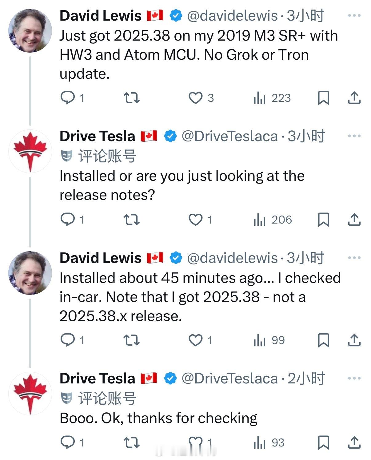 海外的HW3/Intel 车型开始陆续收到 2025.38固件更新。根据网友反馈,Intel 车型的更新里并没有备受期待的Grok 以及 Tron模式 可视化更新。