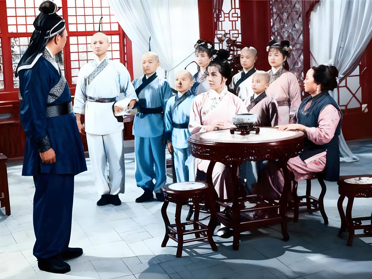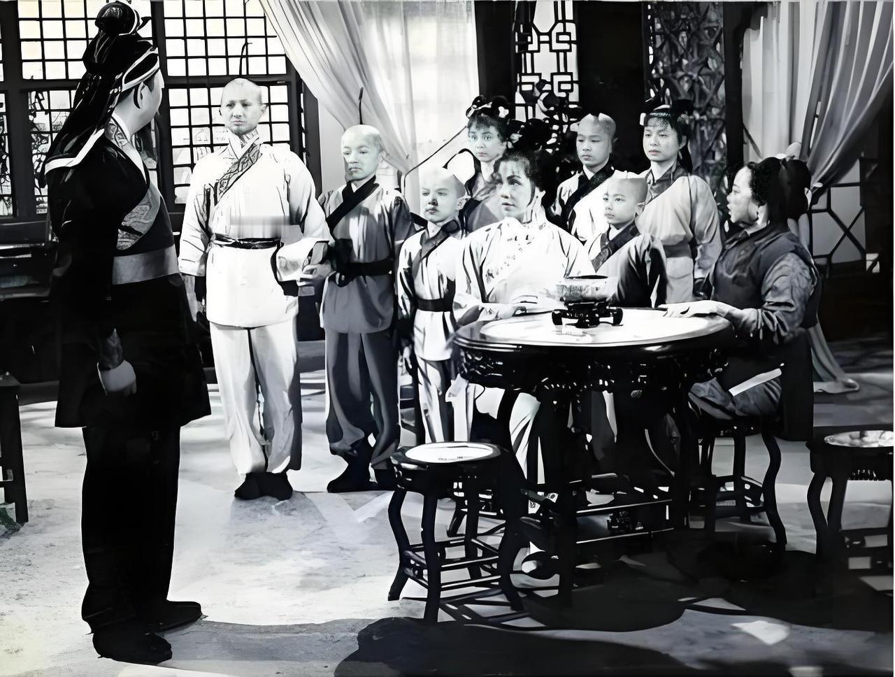 这张图片是1980年香港功夫喜剧电影《恶爷》的剧照。 画面呈现的是一处古色古香的中式室内场景,后排站着的孩子们可不简单,他们从左往右依次是:后排站立者:洪金宝、成龙、元彪、元香、元华、元文、元红