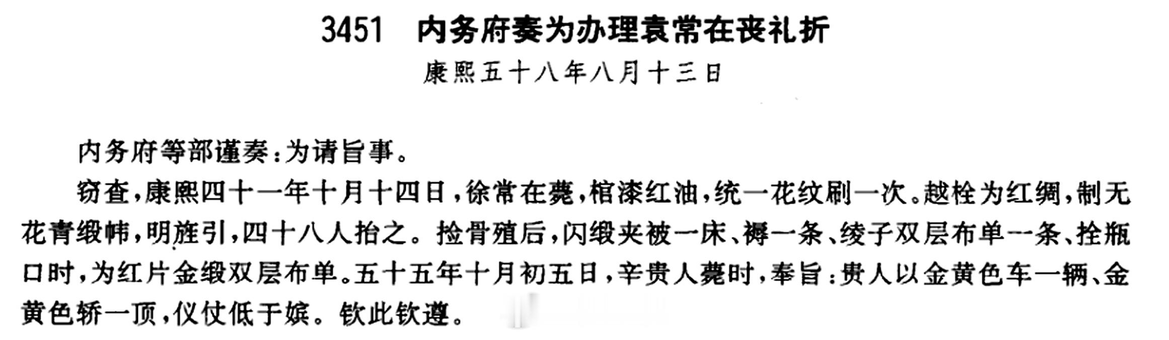 这件内务府奏请袁常在丧事的奏折里提到了死于康熙四十一年十月十四日的徐常在,死后先殓入红油棺内,用48人杠。奏折中有“捡骨殖”“拴瓶口”之类的话,充分表明死后是火化的。