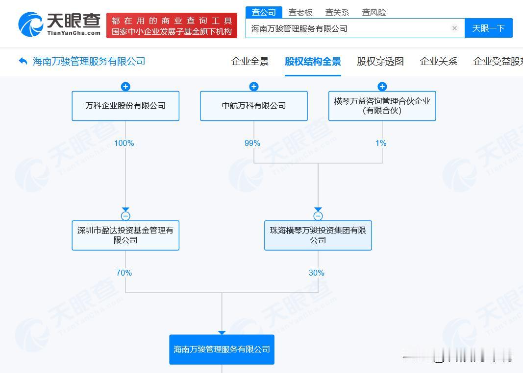 【王健林及万达集团因合同纠纷被起诉 万科旗下公司起诉王健林及万达集团】 天眼查App显示,近日,海南万骏管理服务有限公司与王健林、大连万达集团股份有限公司、万达地产集团有限公司相关合同纠纷案件新增开庭公告,原告为海南万骏管理服务有限公司,该案件将于11月3日在上海市第二中级人民法院开庭审理。 股权全景穿透图显示,海南万骏管理服务有限公司由万科旗下深圳市盈达投资基金管理有限公司以及珠海横琴万骏投资集团有限公司分别持股70%、30%。近期,王健林相关事件一度引发热议。 天眼查信息: