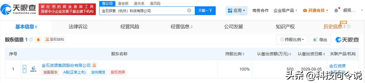 【金石资源在杭州成立探索科技公司注册资本500万】 天眼查App显示,近日,金