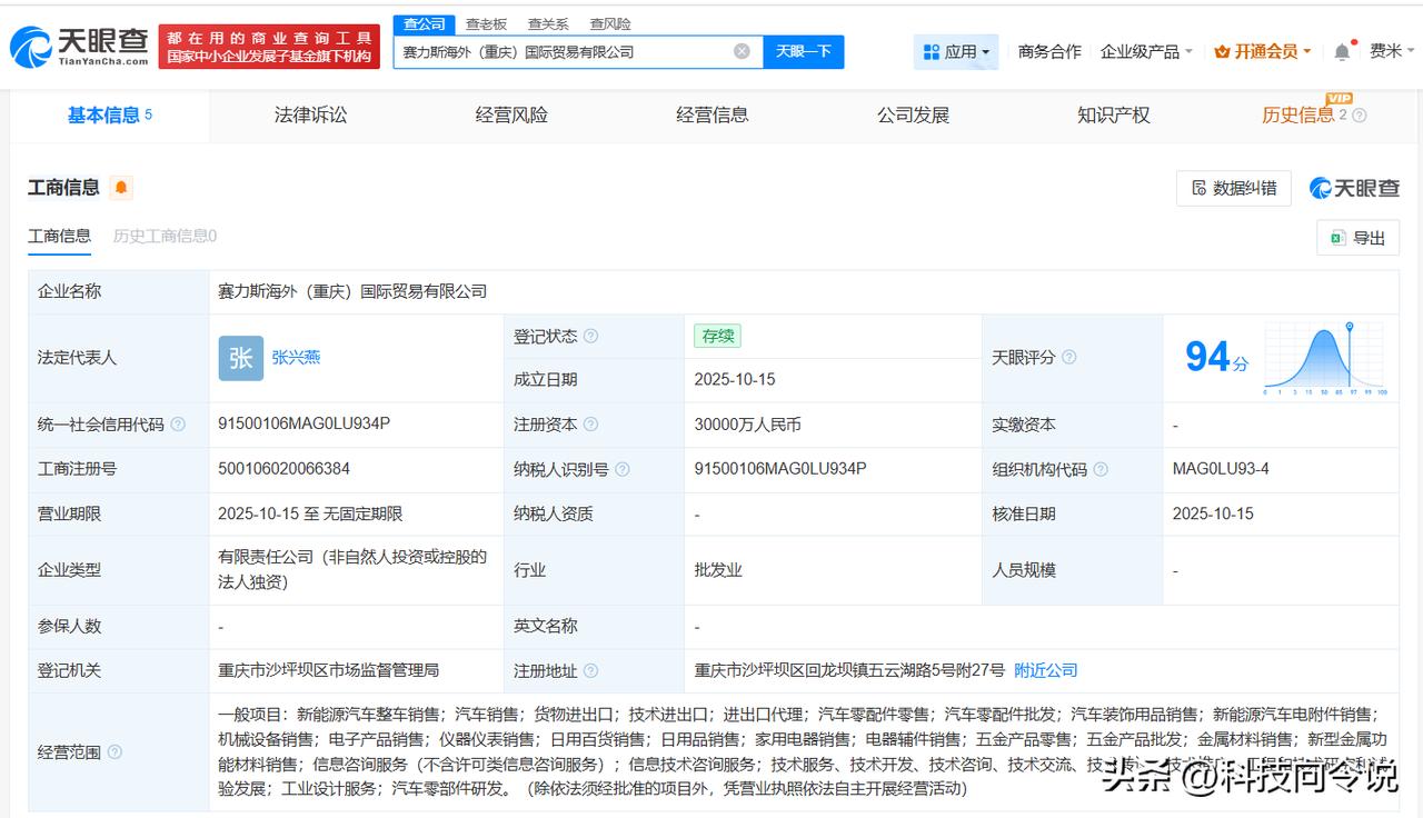 【赛力斯成立国际贸易公司注册资本3亿】 天眼查App显示,近日,赛力斯海外(重