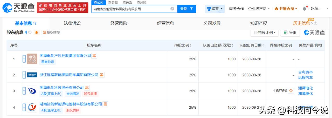 【湘潭电化、吉利等成立新能源材料研究院公司注册资本4000万】 天眼查工商信息