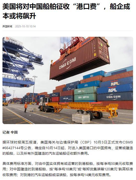 美国对中国船舶的“入港费”昨天正式生效,可执行规则却让整个航运圈看懵了:一艘船可能要交几百万美元,全靠船东自己判断该不该交、交多少,负责监管的海关和边境保护局(CBP)连人都凑不齐。 美国对中国船舶的 “入港费” 正式生效当天,整个航运圈就陷入了困惑。多家航运企业打开美国海关和边境保护局(CBP)发布的规则文件后发现,里面根本没有明确的收费标准,只笼统写着 “根据船舶吨位、载货类型及航行路线综合计算”,至于具体的计算系数、减免条件等关键信息,全都没有提及。 更让企业头疼的是,一艘大型货轮按文件里宽泛的描述估算,可能要缴纳几百万美元费用,可到底该交多少,只能靠自己摸索判断。 航运行业里,无论是深耕多年的老牌企业,还是刚起步的中小型公司,都在为这份模糊的规则发愁。不少企业专门组织团队研究文件,甚至反复查阅 CBP 官网,试图找到补充说明,可折腾半天还是一无所获。 有人尝试联系 CBP 咨询,要么电话无人接听,要么接通后对方表示 “尚未收到详细执行指引”,只能让企业暂时等待。这种情况下,企业既不敢随意估算费用,又怕耽误船舶靠港,陷入两难境地。 更离谱的是,有消息透露 CBP 负责监管 “入港费” 收取的人员都没完全到位。常跑美国航线的从业者反馈,联系部分美国港口的 CBP 工作人员时,对方直言 “团队还在培训阶段,对于收费金额的核查流程和标准,目前也没有完全掌握”。 这意味着,即便企业耗费精力算好费用交上去,后续能否通过核查、会不会被要求补交费用,都存在极大不确定性。 其实早在几个月前,美国放出要征收 “入港费” 的消息时,航运圈就普遍关注。大家原本以为,涉及巨额费用的政策,一定会配套清晰的实施细则,毕竟规则明确才能保障航运秩序稳定。 可没想到,直到政策生效前一天,CBP 才匆匆发布一份简短文件,里面满是模糊表述,关键信息一个都没讲透,完全打乱了企业的运营计划。 对中小型航运公司来说,几百万美元的 “入港费” 本就是不小的压力,规则不明确更让他们雪上加霜。如果因为费用计算失误,要么得临时拆借资金补交,要么可能被限制靠港,进而影响整个运输链条的正常运转。 如今航运圈里,企业之间都在互相打听最新执行消息,不少企业还联合起来向行业协会反映情况,希望能推动 CBP 尽快明确规则。部分企业已经开始调整美国航线的运力安排,原本计划出发的货轮,纷纷推迟船期,“等规则清晰了再走,不然到了港口出问题,损失就太大了”。 这种仓促出台的收费规则,不仅让中国航运企业犯难,连美国本土的港口运营商也觉得麻烦。美国多个港口的工作人员表示,最近咨询 “入港费” 的中国航运企业特别多,可他们也没法给出准确答复,只能让对方等待,“这既影响港口的作业效率,也容易引发不必要的矛盾”。 对此,你们有什么看法,欢迎评论留言~