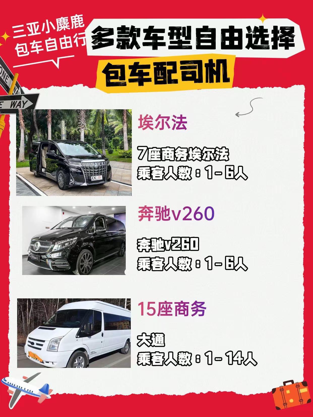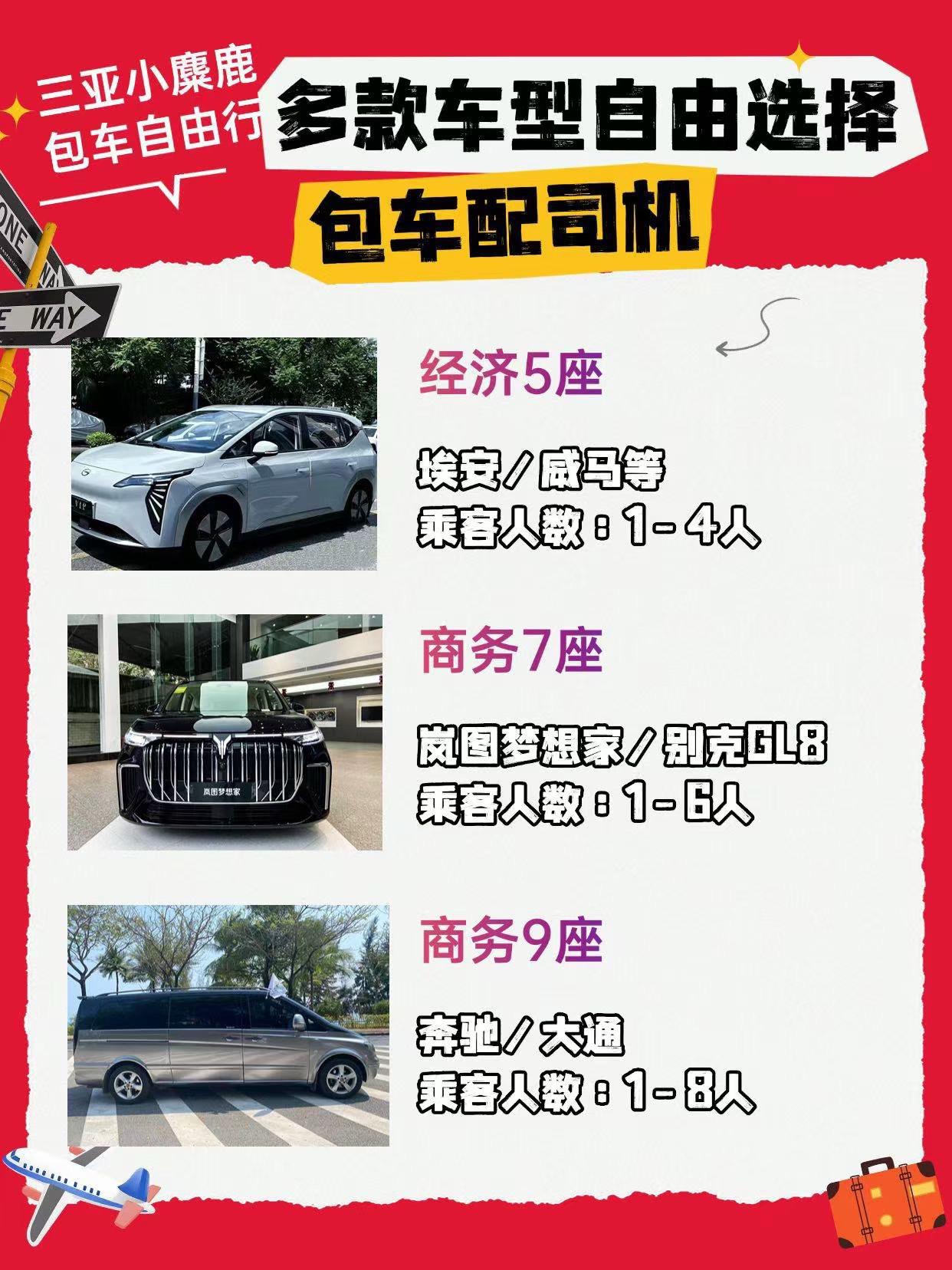 🚗海南包车攻略|按人数&预算闭眼选车型。宝子们来三亚,包车真的能解锁度假顶配体验!不同车型适配不同需求,一句话说清怎么选👇 5座埃安 4人+2件行李无压力,车身小巧市区穿梭灵活,经济型出行首选。 7座迈巴赫 立标气场拉满,后排航空按摩座椅+小桌板,移动的高端会客厅。 7座埃尔法 明星同款保姆车,隐私窗帘+商务接待或高端家庭游超有面。 7座别克GL8 空间超能装,二排通风加热座椅像沙发,带娃家庭或小团体性价比之王。 7座岚图梦想家 新能源黑科技,星空顶+航空按摩椅,三排空间宽敞,带娃出