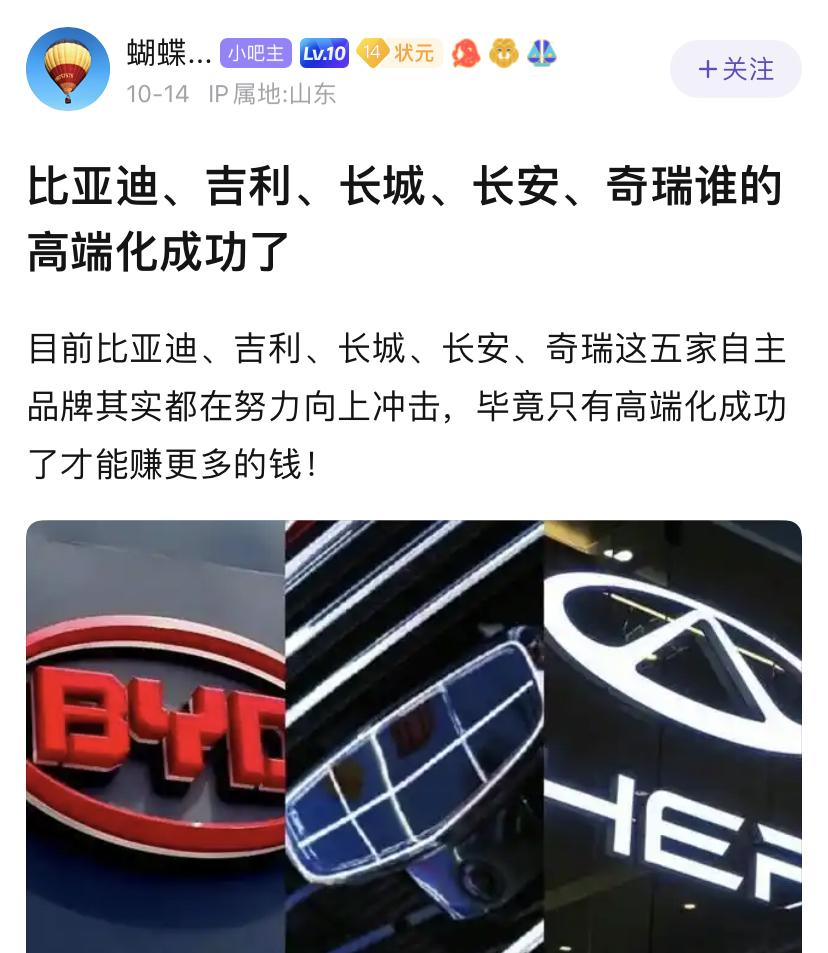比亚迪、吉利、奇瑞,这几个老伙计,谁的高端化成功了?