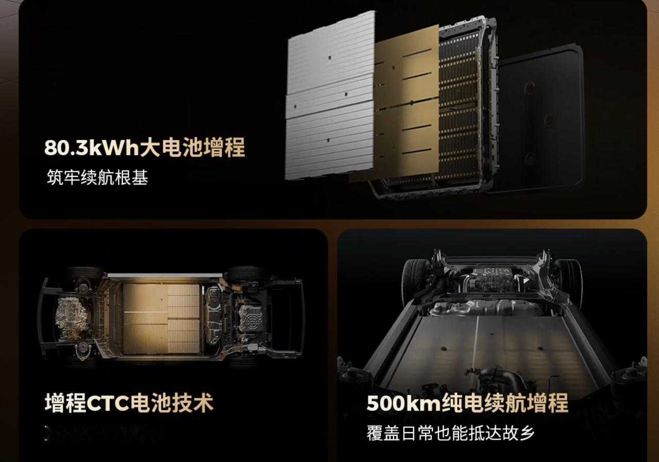 增程版采用800伏CTC增程技术及智能增程四驱,系统综合功率400千瓦,匹配80