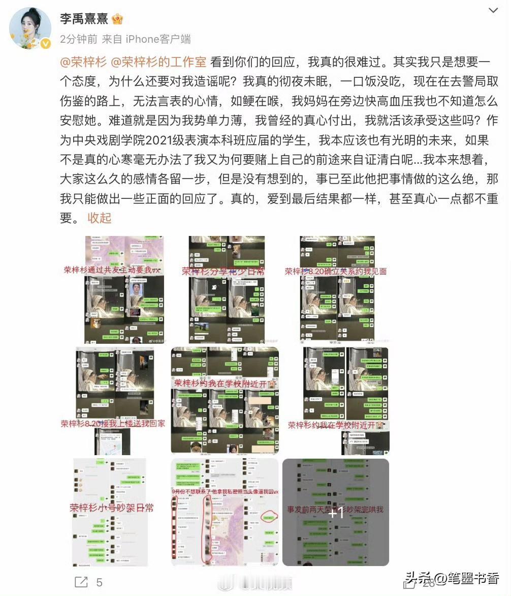 @李禹熹熹 再发文,回应@荣梓杉 方声明:看到你们的回应,我真的很难过。其实我只是想要一个态度,为什么还要对我造谣呢?我真的彻夜未眠,一口饭没吃,现在在去警局取伤鉴的路上,无法言表的心情,如鲠在喉,我妈妈在旁边快高血压我也不知道怎么安慰她。难道就是因为我势单力薄,我曾经的真心付出,我就活该承受这些吗?作为中央戏剧学院2021级表演本科班应届的学生,我本应该也有光明的未来,如果不是真的心寒毫无办法了我又为何要赌上自己的前途来自证清白呢…我本来想着,大家这么久的感情各留一步,但是没有想到的,事已至此他把事情做的这么绝,那我只能做出一些正面的回应了。真的,爱到最后结果都一样,甚至真心一点都不重要。
