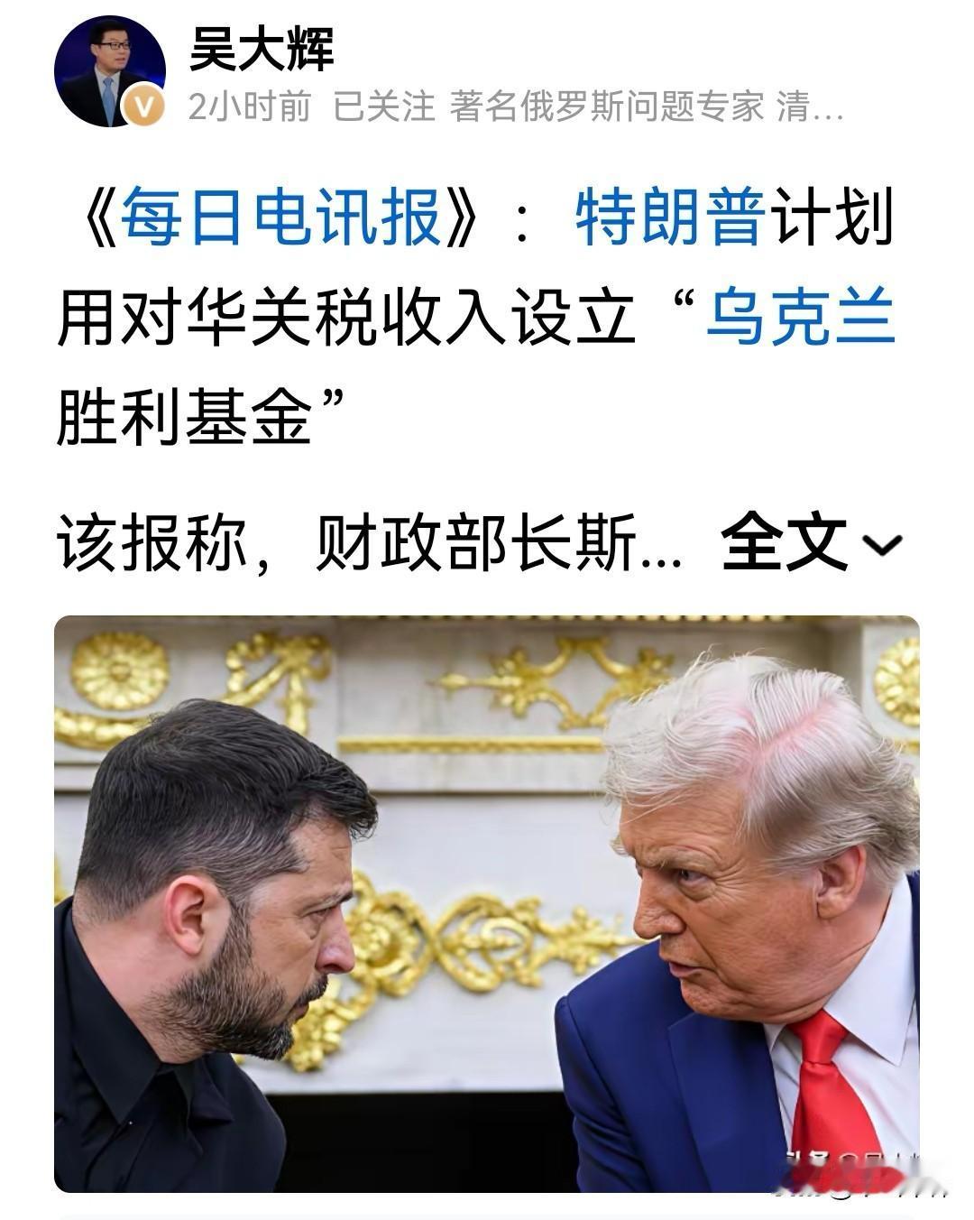 美国的黄粱美梦:特朗普计划用对华关税收入设立“乌克兰胜利基金”! 据《每日电讯报》报道,特朗普计划用对华关税收入设立“乌克兰胜利基金”。 先不说这一消息是真是假?但无论真假都是黄粱美梦,是不可能实现的事。 该报道中还提到,美国财长贝森特已奉命在泽连斯基周五(17日)访美前夕,向欧洲同行提交这一方案,内容包括拟对中国进口商品征收500%的关税。 这样看该方案就更不可能了,因为正常讲关税达到100%以上,两国之间的贸易基本上就停止了,更何况关税达到骇人听闻的500%,那就完全脱钩了。 退一万步讲,即使在500%关税情况下,美国还坚持进口中国商品,那么由此引起的物价剧烈上涨,肯定由消费者来负担,中国绝对不出这种冤枉钱。 可见,所谓计划用对华500%关税收入设立“乌克兰胜利基金”一说,根本就是自欺欺人的恶作剧,根本不成立,或者说是大白天做美梦! 弱弱问一句,即使乌克兰有了这个胜利基金,他们就能胜利吗?条件是只能等到太阳从西边出来。不信走着瞧,俄乌冲突不管打几年,估计笑到最后的一定是俄罗斯!
