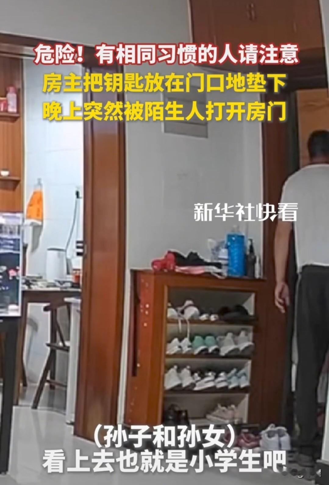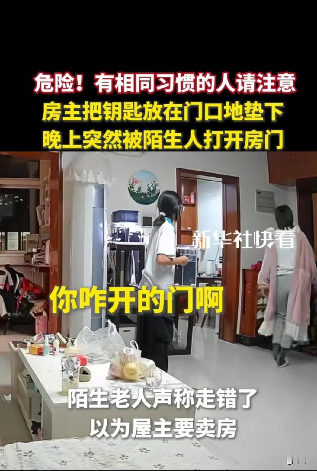 危险! 有相同习惯的人一定要注意 房主把钥匙藏在门口地垫下,晚上一家人在家时,房门突然被陌生人打开!一家人惊呆了。 打开门的老人解释: 是孙子,孙女把他带过来的走错了门。 看门口放着垃圾以为房子卖了,没人住了。 很多人图方便把钥匙藏在门口地垫、消防栓等位置。 快递单不撕是随手一扔,省事。 家门不反锁,嫌麻烦。 看上去只是偷懒的小问题,却埋下了安全隐患。 安全不是靠幸运, 而是藏在多一分细心的习惯当中。 家门钥匙 家门惊险事件 房门上密码锁