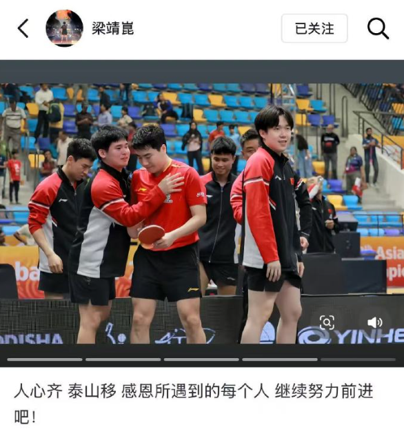 2025年乒乓球亚锦赛落幕。10月16日,国乒队员梁靖崑发文:人心齐,泰山移,感