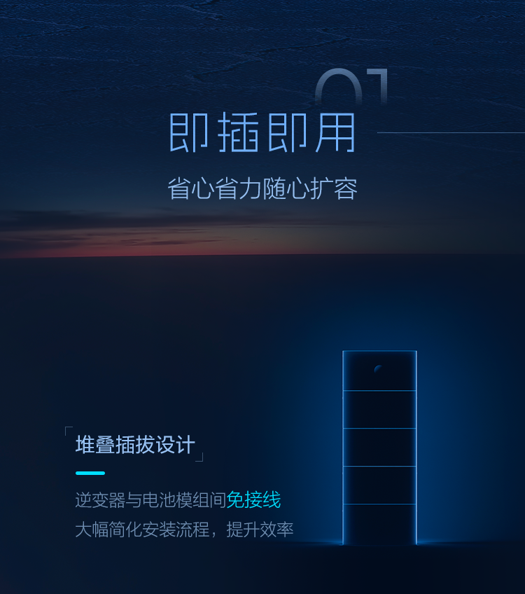 堆叠插拔设计,逆变器与电池模组间免接线,大幅简化安装流程,提升效率。