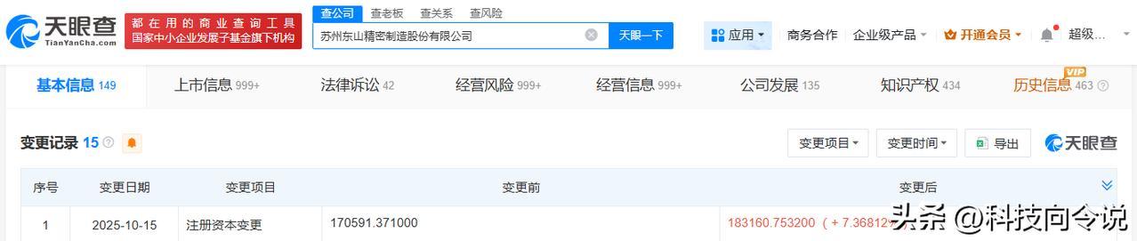 【东山精密增资至18.3亿】 天眼查工商信息显示,近日,东山精密(002384)发生工商变更,注册资本由约17.1亿人民币增至约18.3亿人民币。 苏州东山精密制造股份有限公司成立于1998年10月,法定代表人为袁永刚,经营范围包括精密钣金加工、五金件、烘漆、微波通信系统设备制造等。股东信息显示,该公司由袁永刚、袁永峰、袁富根等共同持股。 天眼查信息: