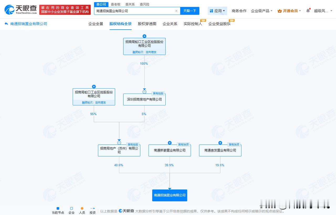 【招商蛇口等在南通成立招瑞置业公司 注册资本18亿】 天眼查工商信息显示,近日,南通招瑞置业有限公司成立,法定代表人为涂辉,注册资本18亿人民币,经营范围包括房地产开发经营、企业管理咨询、信息咨询服务等。股权全景穿透图显示,该公司由招商蛇口(001979)旗下招商局地产(苏州)有限公司以及南通新豪置业有限公司、南通崇发置业有限公司共同持股。 天眼查信息: