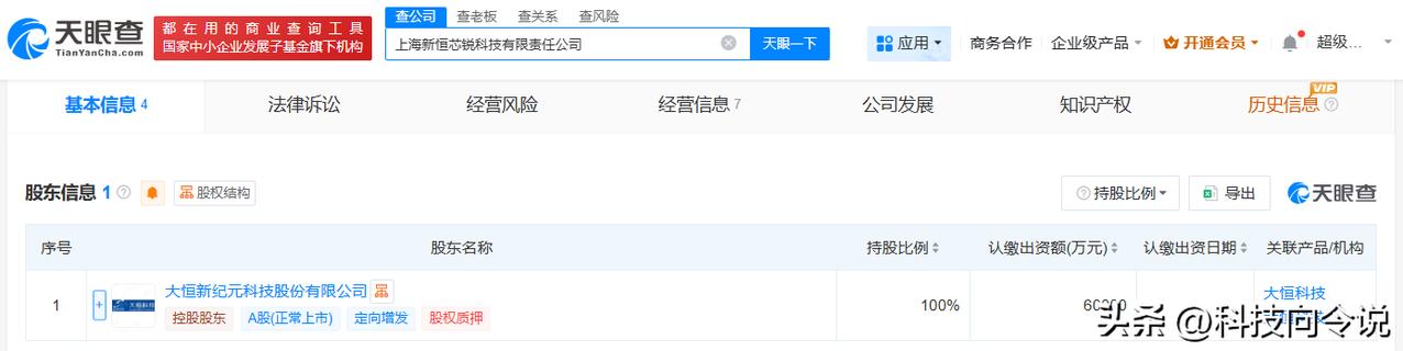【大恒科技在上海成立新恒芯锐科技公司注册资本6亿】 天眼查工商信息显示,近日,