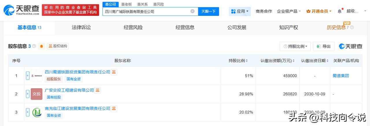 【四川南广城际铁路公司登记成立 注册资本90亿】 天眼查工商信息显示,近日,四川南广城际铁路有限责任公司成立,法定代表人为唐勇,注册资本90亿人民币,经营范围包括公共铁路运输、铁路机车车辆维修、预应力混凝土铁路桥梁简支梁产品生产、建设工程质量检测等。股东信息显示,该公司由四川蜀道铁路投资集团有限责任公司、广安交投工程建设有限公司、南充临江建设发展集团有限责任公司共同持股。 天眼查信息: