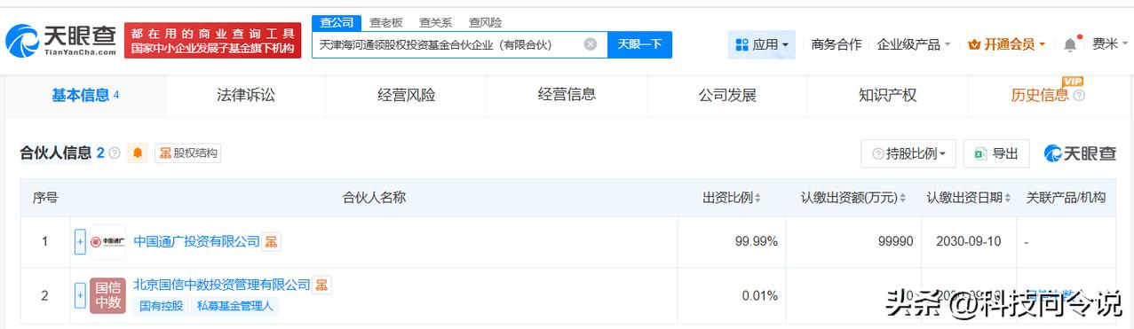 【天津海河通领股权投资基金登记成立 出资额10亿】 天眼查App显示,近日,天津海河通领股权投资基金合伙企业(有限合伙)成立,执行事务合伙人为北京国信中数投资管理有限公司,出资额10亿人民币,经营范围为以私募基金从事股权投资、投资管理、资产管理等活动,由中国通广投资有限公司、北京国信中数投资管理有限公司共同出资。 天眼查信息: