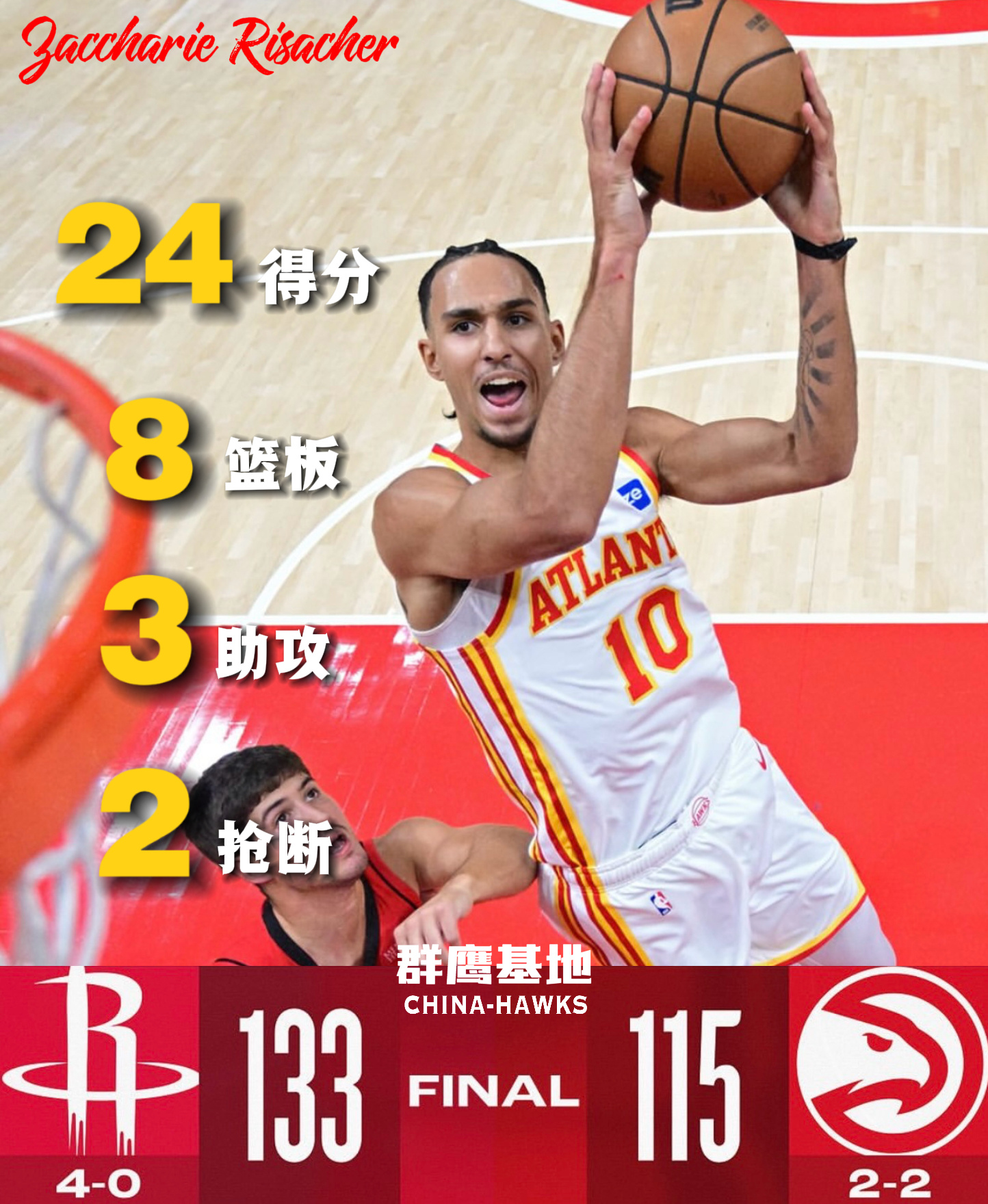 · Zaccharie Risacher全场攻下24分8篮板2抢断,展现全面身手与出色侵略性,未来值得期待