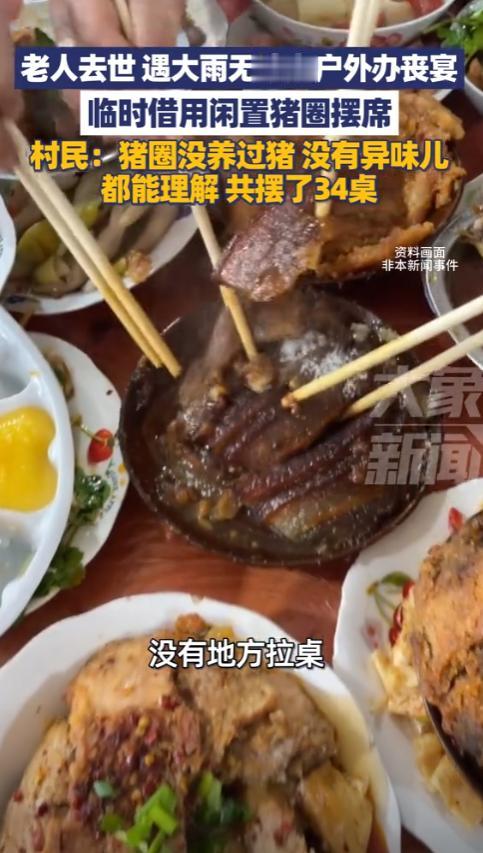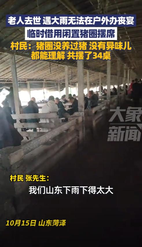 山东菏泽,一老人离世后办丧宴,结果因外面下着大雨,根本无法摆桌,只好先借村民的猪