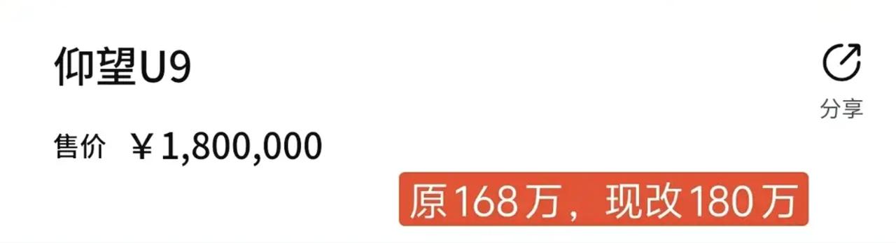居然涨价了?!仰望U9售价上涨12万 售价180万 前段时间仰望U9Xtreme斩获全球极速纪录第一名,超过了布加迪。没想到这前脚创造纪录,这后脚居然涨价了,由原来的168万涨到了180万!整整12万的上涨还是非常夸张的,大家觉得这波涨价合理吗?会有那么多人花180万买这个车吗?【来自懂车帝车友圈】
