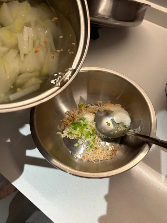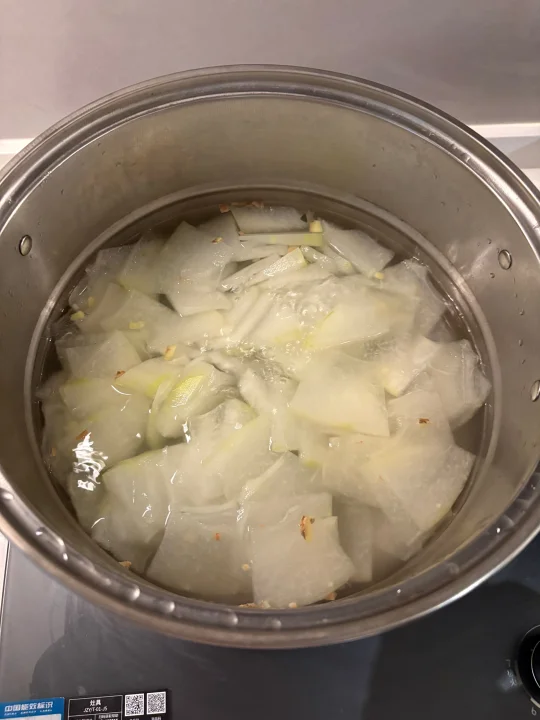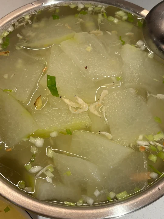 做法🍃🍃🍃 冬瓜去皮切片冲洗干净,倒入锅中煮十多分钟,清水煮熟即可,可以放一些姜蒜末,盆里放入虾米,猪油,小葱末,盐巴,鸡精,再将煮好的虾米倒入即可。