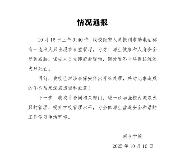 目前,新余学院已对涉事保安作出开除处理,并对此事造成的不良后果深表遗憾和歉意!
