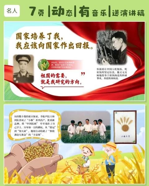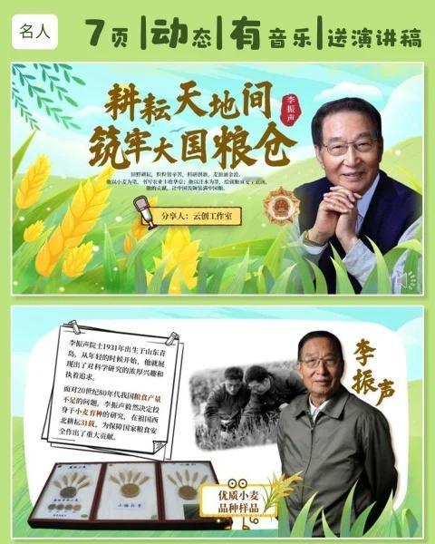 李振声 耕耘天地间 筑牢大国粮仓 ppt ✏️页数:7 ????送演讲稿(659字) ???? 田野耕耘,粒粒皆辛苦,科研创新,麦浪涌金波。他以小麦为笔,书写农业丰收华章;他以汗水为墨,绘就粮食安全蓝图,他的贡献,让中国饭碗装满中国粮。 李振声院士1931年出生于山东青岛,从年轻的时候开始,他就展现出了对科学研究的浓厚兴趣和执着追求。面对20世纪80年代我国粮食产量不足的问题,李振声毅然决定投身于小麦育种的研究,在祖国西北耕耘31载,为保障国家粮食安全作出了重大贡献。…… ppt 名人故事 PPT 小学生ppt 李振声 杂交小麦之父李振声 共和国勋章 山东名人 名人演讲
