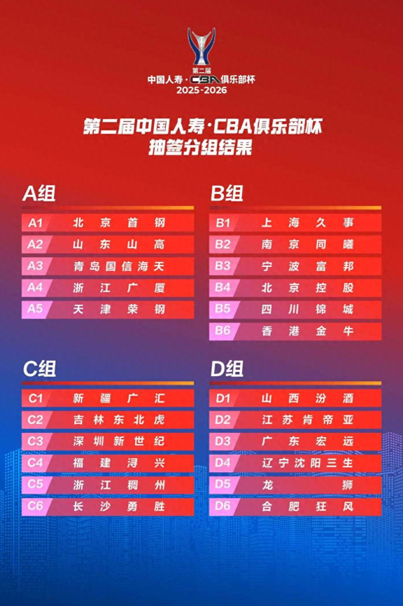 CBA公司公布了第二届CBA俱乐部杯小组赛分组抽签结果,山东高速男篮和北京首钢、青岛国信、浙江广厦、天津队同组。广厦和首钢分别是上赛季CBA联赛的冠亚军,青岛国信上赛季也晋级季后赛八强,山东男篮小组出线面临不小压力。 第二届CBA俱乐部杯共有23支球队参加,除了20支CBA球队,还有三支NBA球队参赛,分别是排今年NBL联赛前三名的香港金牛、长沙勇胜和合肥狂风。23支球队共分为四个小组,除了山东男篮所在的A组有5支球队,其余三组均为6支球队。小组赛实行单循环赛会制,各小组前两名晋级决赛阶段。小组赛比赛时间是2025年12月3日—8日,具体地点尚未公布。决赛阶段比赛定于2026年2月6日—12日。 按照CBA公司之前发布的竞赛规程,第二届CBA俱乐部杯冠军将获得200万元奖金(含税),亚军奖金是140万元。关于外籍球员出场,第二届CBA俱乐部杯竞赛规程规定,所有球队外籍球员执行4人(最多)4节8人次,每节最多2人次。其中NBL俱乐部报名参赛外籍球员不得少于2人,不得超过4人,且以中国篮协最终审核确认的注册名单为准。上届杯赛,上海久事男篮夺得冠军,外援布莱德索当选MVP,山东高速男篮获得小组出线权,但在决赛阶段首轮不敌北京首钢。
