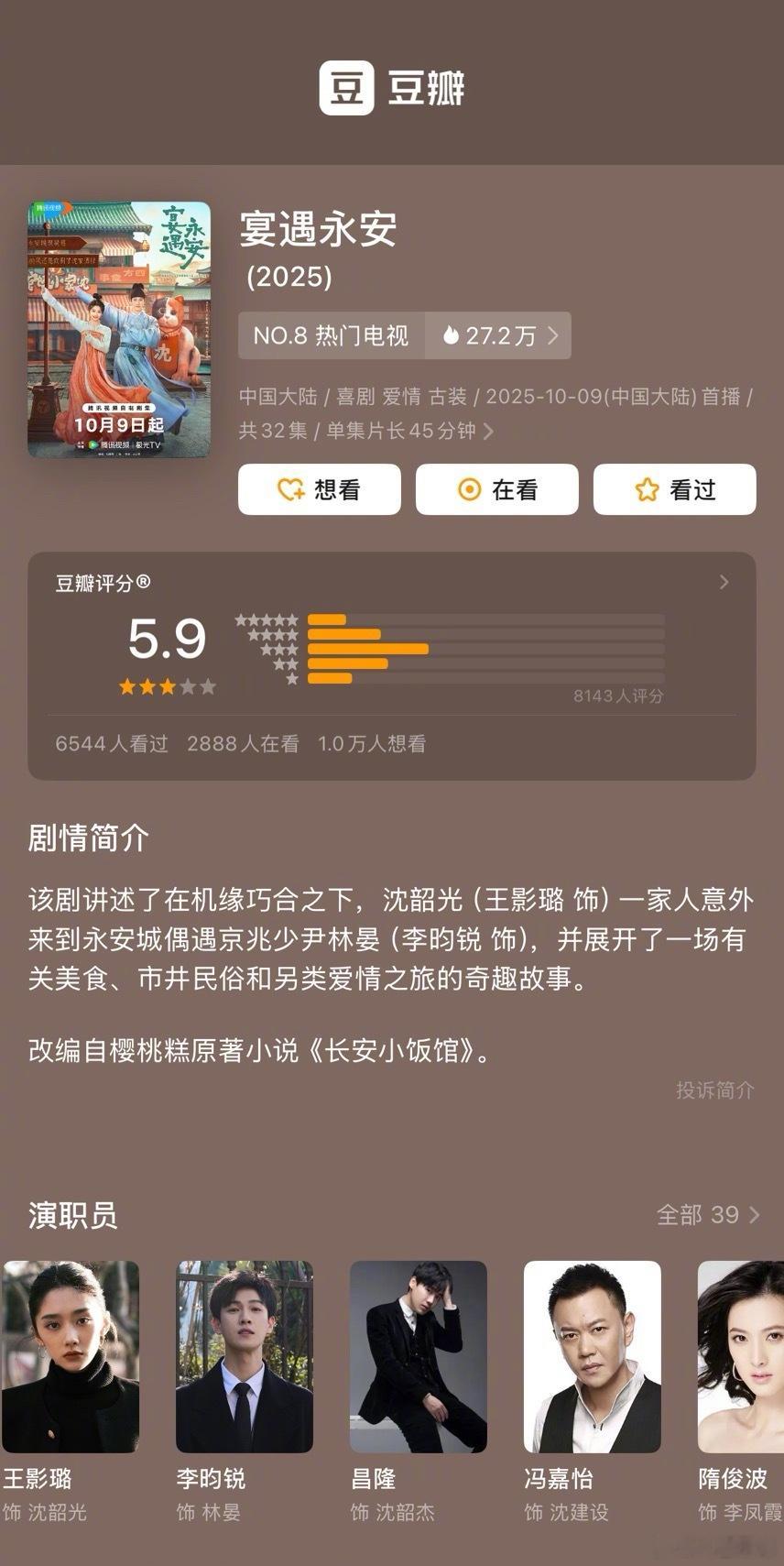 王影璐、李昀锐《宴遇永安》豆瓣开分5.9分