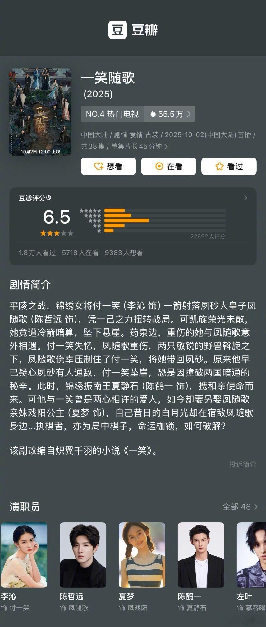 李沁、陈哲远《一笑随歌》豆瓣开分6.5分