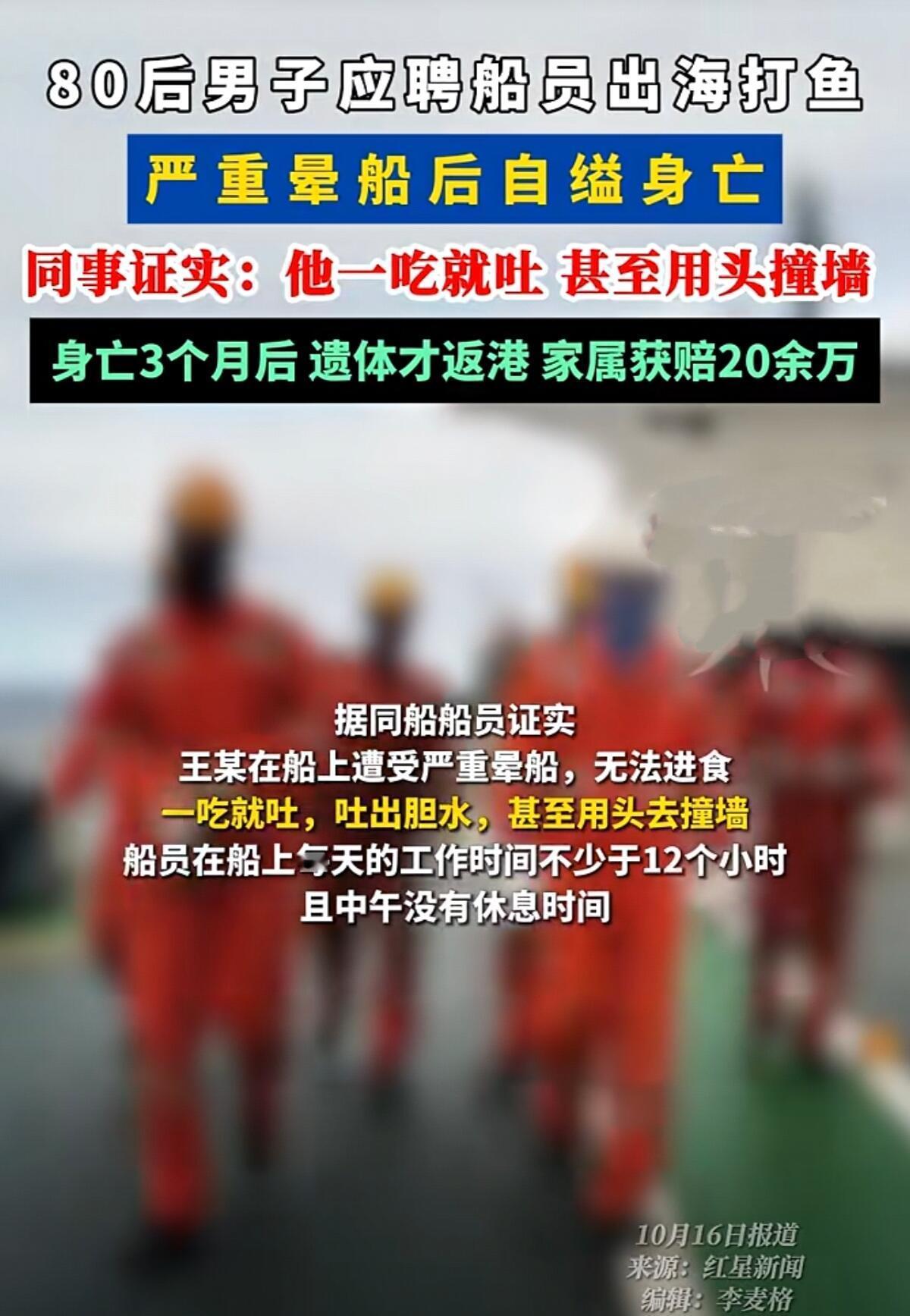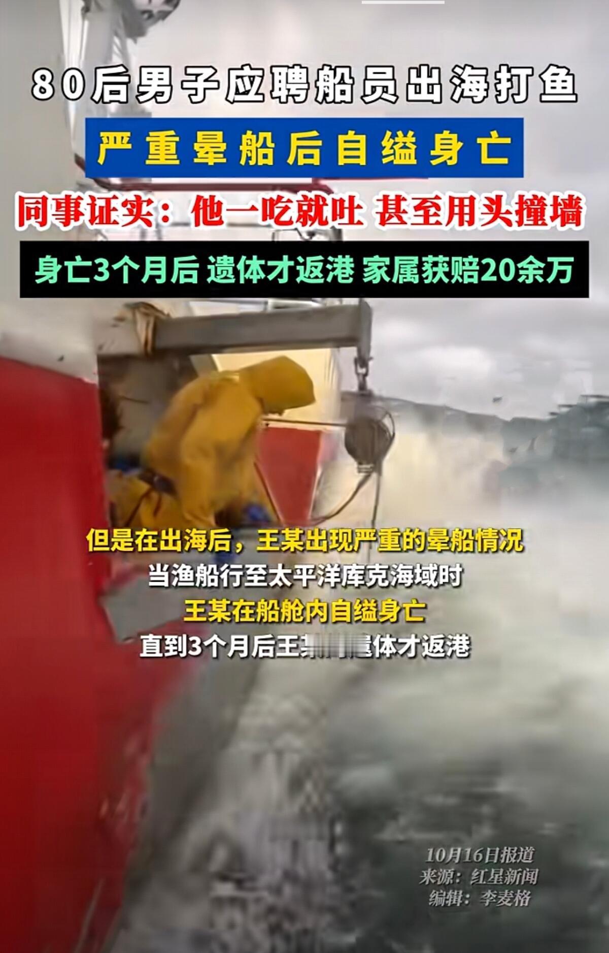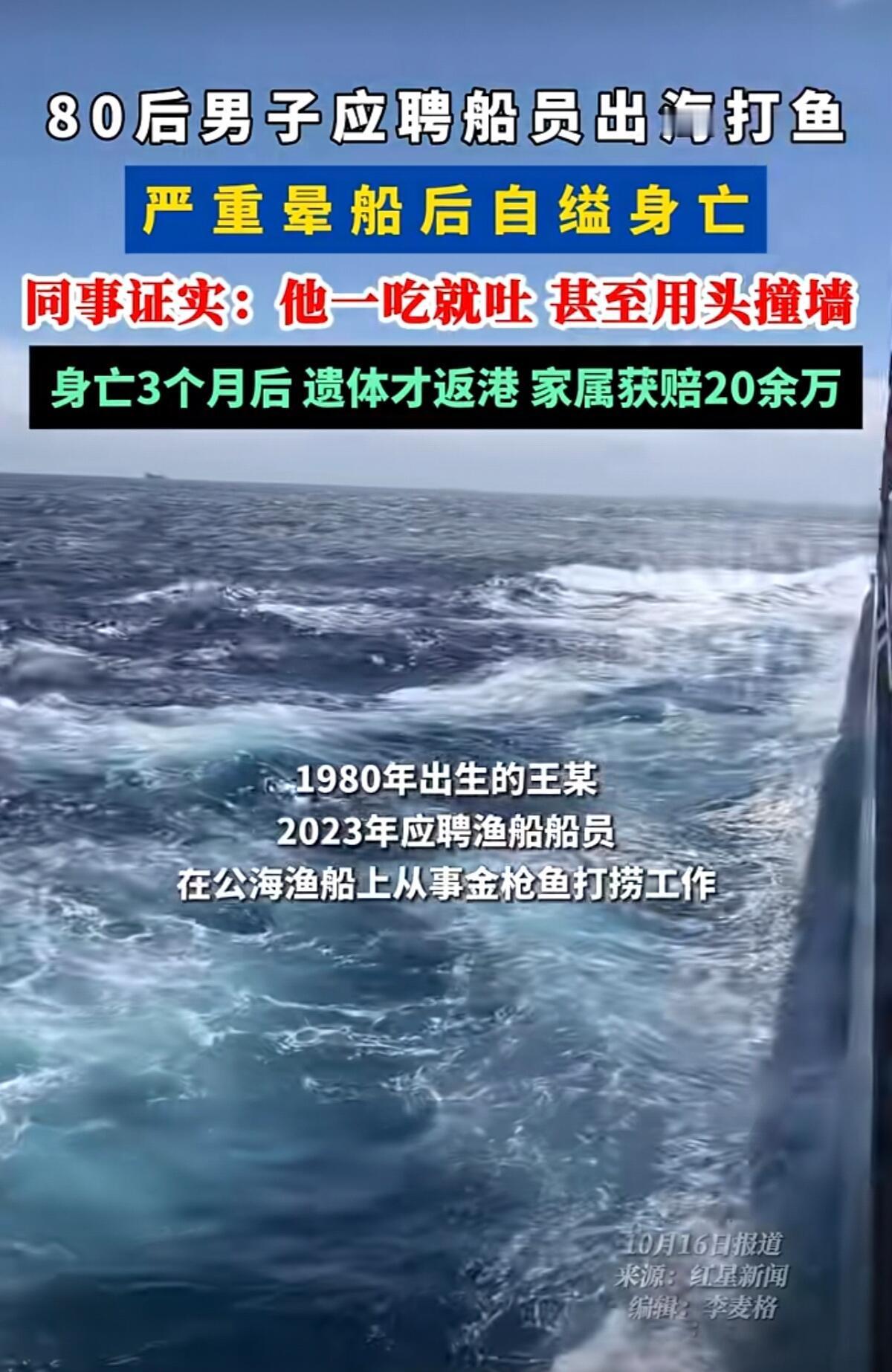 这事儿听着就让人心里发堵。一个80后男人,为了养家第一次出海打鱼,结果在太平洋上因为晕船太严重,实在熬不住,用一根绳子结束了自己的生命。 2023年3月,王某和船员公司签了合同,满怀希望上了远洋渔船,想着靠捕捞金枪鱼赚钱养家。可他根本不知道自己会晕船晕得这么厉害——船一晃他就吐,风浪大的时候连胆汁都吐出来了,没几天人就瘦得不成样子。 船上条件也差,他住的那个小杂物间紧挨着机舱,机器24小时轰隆隆响,连个空调都没有。身体难受加上环境恶劣,他精神慢慢崩溃了,开始用头撞墙,拿东西砸自己。同船的人都看出来他不对劲,可船上连个医生都没有,每天还要干12小时以上的重活。 最后等船员发现时,人已经没了。三个月后,他的遗体才随船回到国内。两家公司和他母亲签了调解协议,给了21万。可他家里还有三个未成年的孩子,这点钱根本不够,家属起诉要求赔200多万,结果法院没支持。 说实在的,这事暴露了远洋渔业太多问题。招人的时候根本不测试会不会晕船,上了船连基本医疗保障都没有。人在海上,晕船加上焦虑,真的能把人逼上绝路。 现在说什么都晚了,三个孩子永远失去了父亲。20万买不回一条命,只希望这个悲剧能让人警醒:别让劳动者用生命去冒险,再苦再累的工作,也得保障人最基本的尊严和安全。