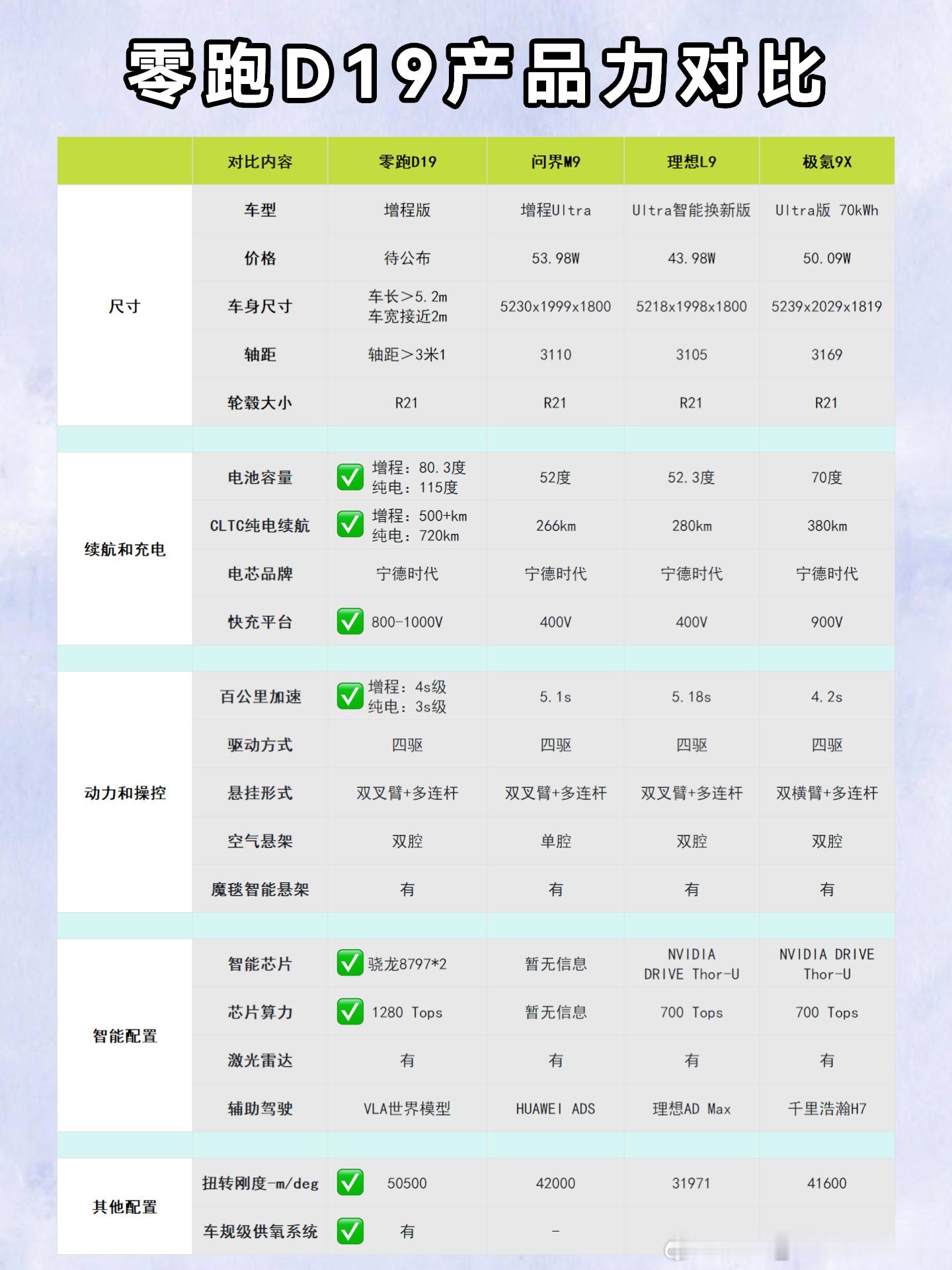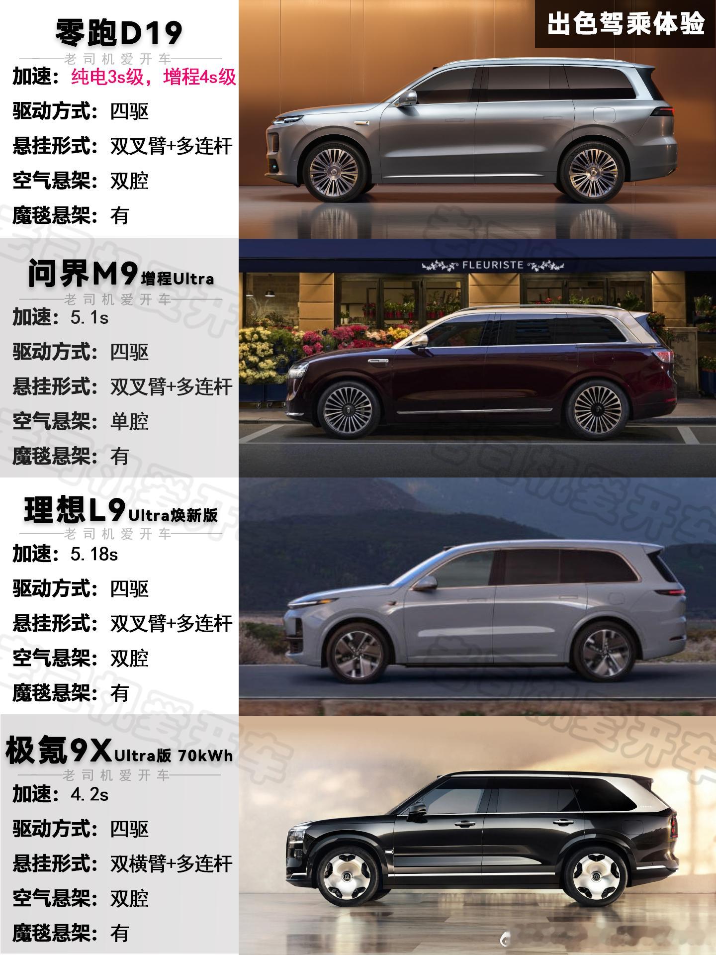 竞争对手的混动版,加速一般在5s左右,只有极氪9X达到4.2s。而零跑D19增程版电机功率400kW,加速4s级;而纯电版电机功率540kW,配备三电机,加速3s级。