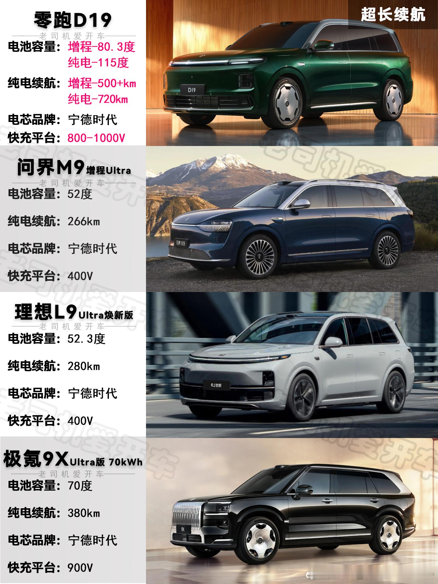 而纯电版的D19,电池更是达到115度,纯电续航720km。对比一下,问界M9的100度电池纯电版,续航在605km。