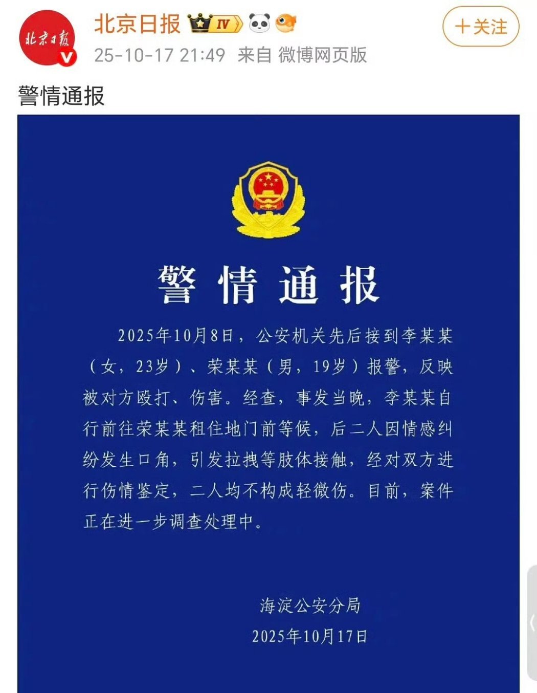 海淀警方通报荣梓杉李禹熹纠纷 这下不是朝阳,是海淀蓝底白字,说荣梓杉报警说被李禹熹殴打.......算什么男人[微笑]