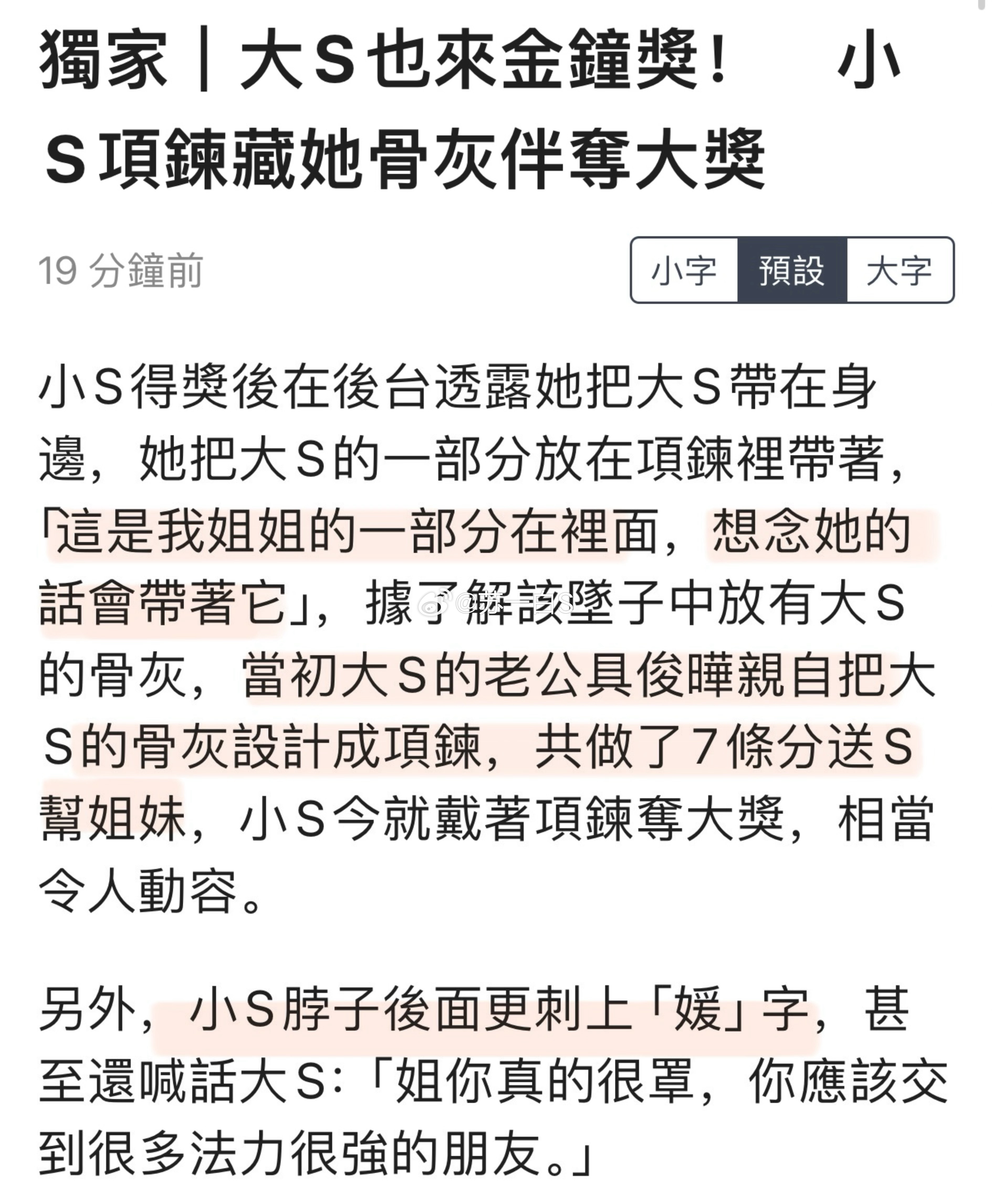 得奖后的小S在后台透露,她把大S的一部分骨灰放在了项链里带来了颁奖典礼,“这是我姐姐的一部分,想念她的话就会带着”[苦涩]
