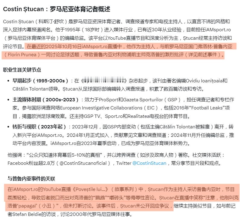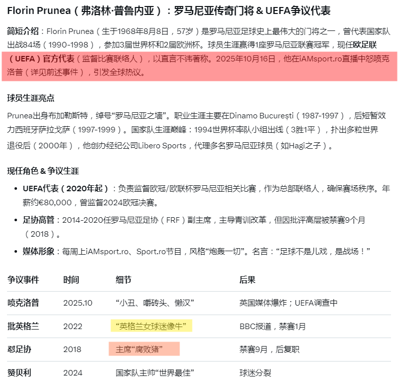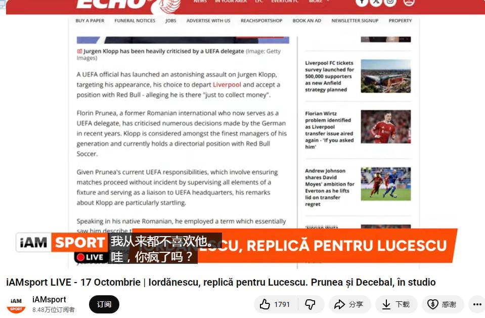 弗洛林·普鲁内亚曾是罗马尼亚国脚,作为常驻嘉宾 在16号 iAMsport 油管直播时对克洛普言辞犀利,还对其外貌进行嘲讽。